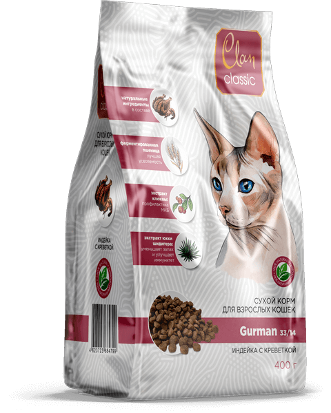 Корм для кошек сухой CLAN Classic Gurman 33/14 для привередливых в еде, индейка и креветки, 400г 350 ₽