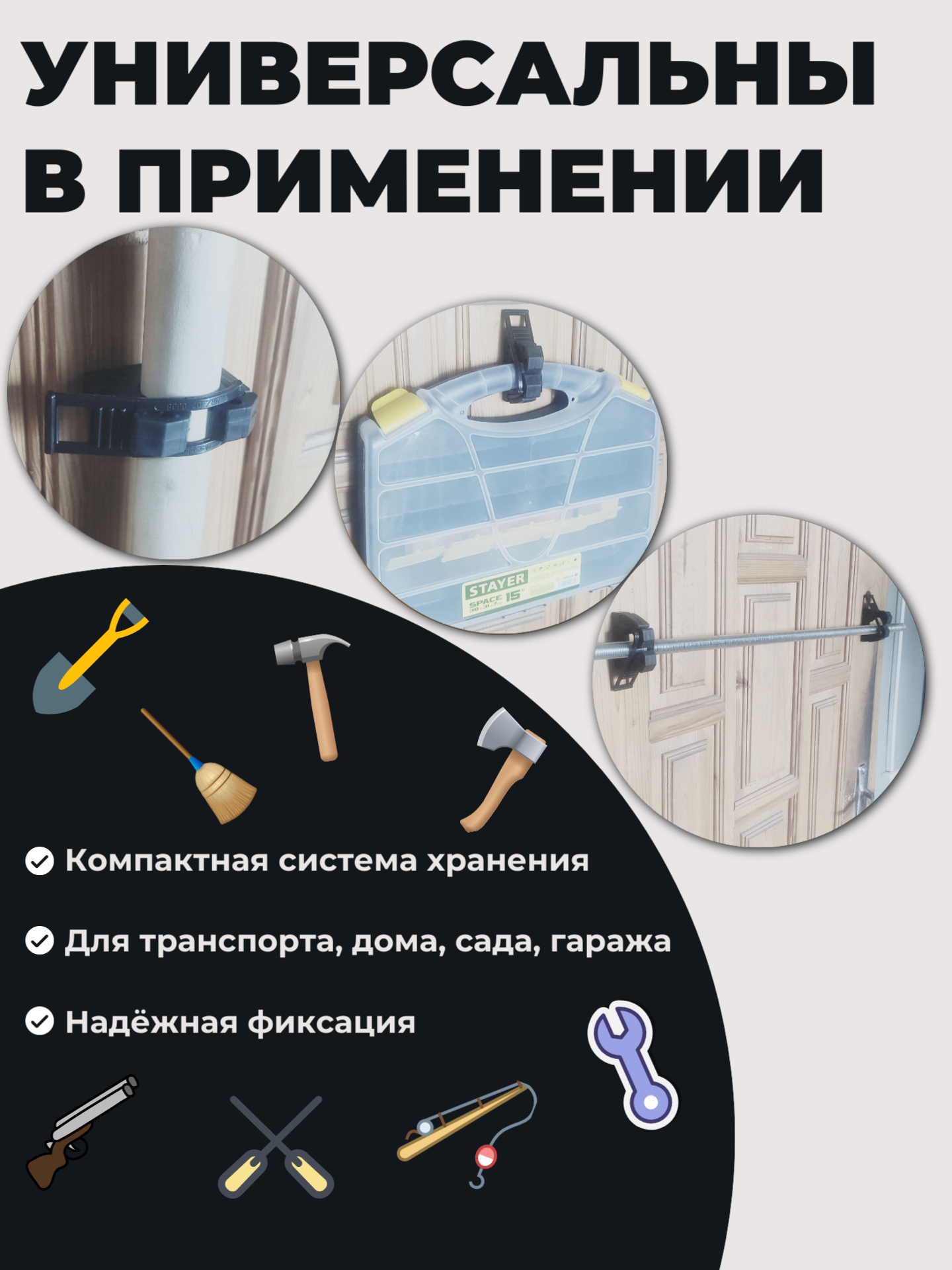Подробная комплектация | 2 полиуретановых держателя для инвентаря (лопат, граблей, черенков, удочек, инструмента и др.) |