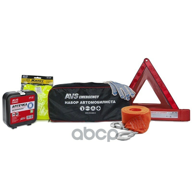 | Дополнительная информация | жилет светоотражающий AVS VT-04 XXL (120гр/м²); аптечка первой помощи автомобильная AVS AP-01 (комплектация аптечки соответствует приказу Минздравмедпрома РФ №325 от 20.08.1996 г., с поправками в редакции приказа Минздравсоцразвития РФ №697Н от 08.09.2009 г.); знак аварийной остановки модель AVS WT-004; трос буксировочный с крюками AVS ET-5S; перчатки х/б с ПВХ; сумка "Набор автомобилиста" AVS SN-01 |