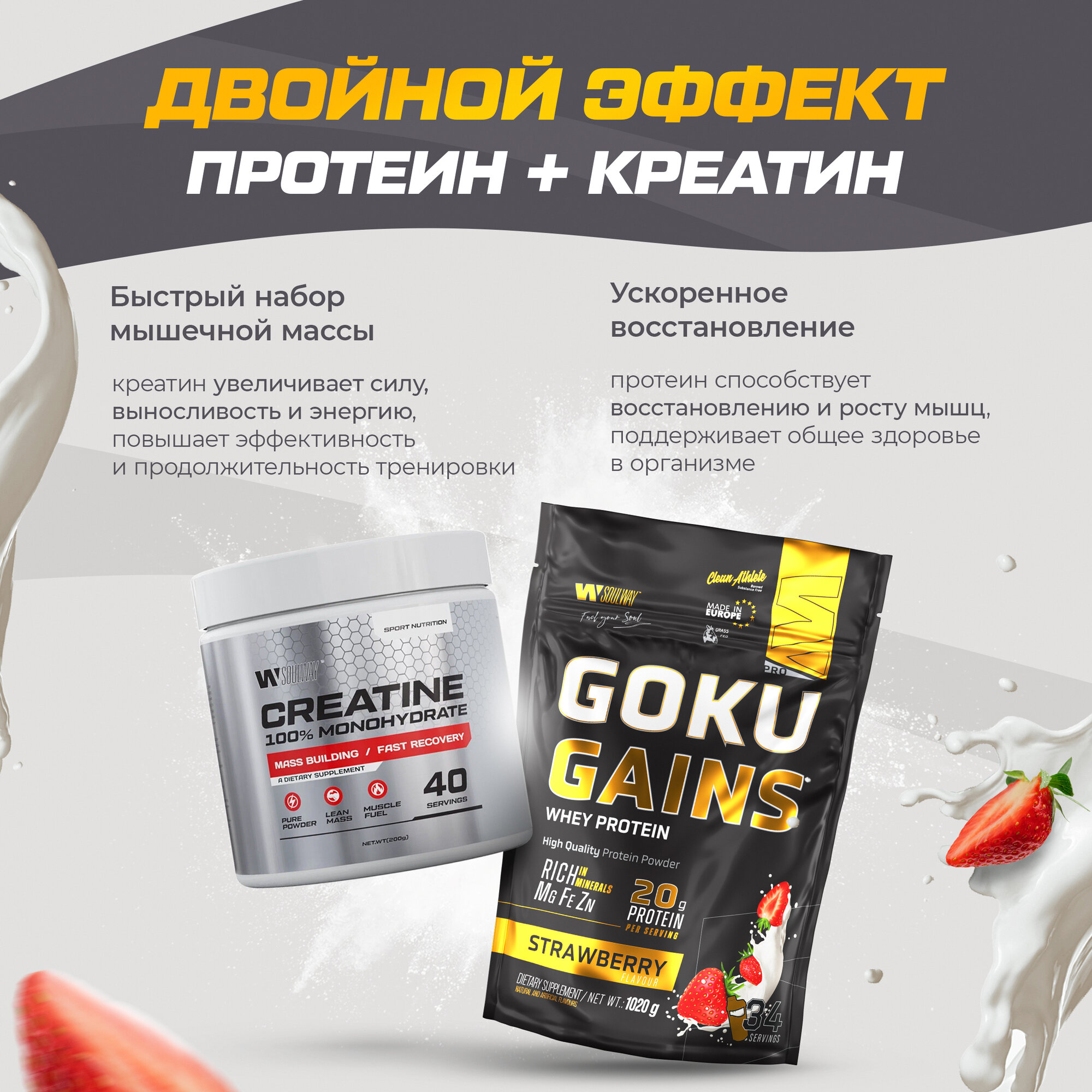 Комбо набор Протеин сывороточный клубничный 1020 гр 34 порций + Креатин моногидрат без вкуса 200 гр 40 порций + Цинк цитрат 90 капусл информация: