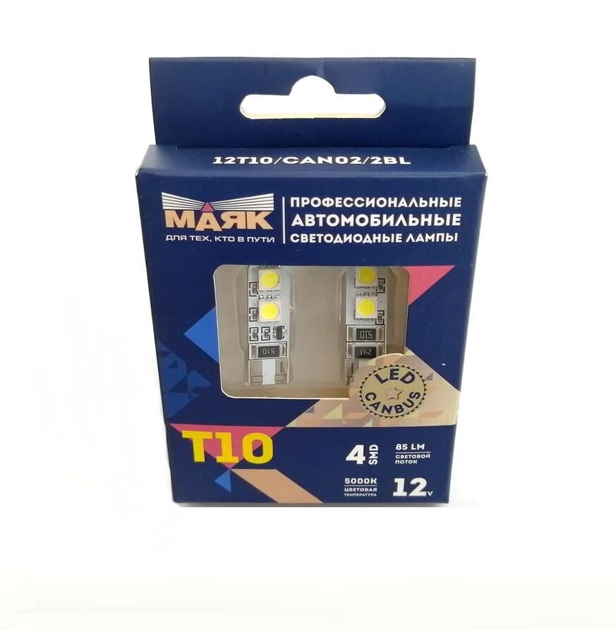 Маяк 12T10CAN022BL Лампа светодиодная А12-5 (T10-4SMD) маяк бесцокольная к-т 2шт, с обманкой-резистором CANBUS