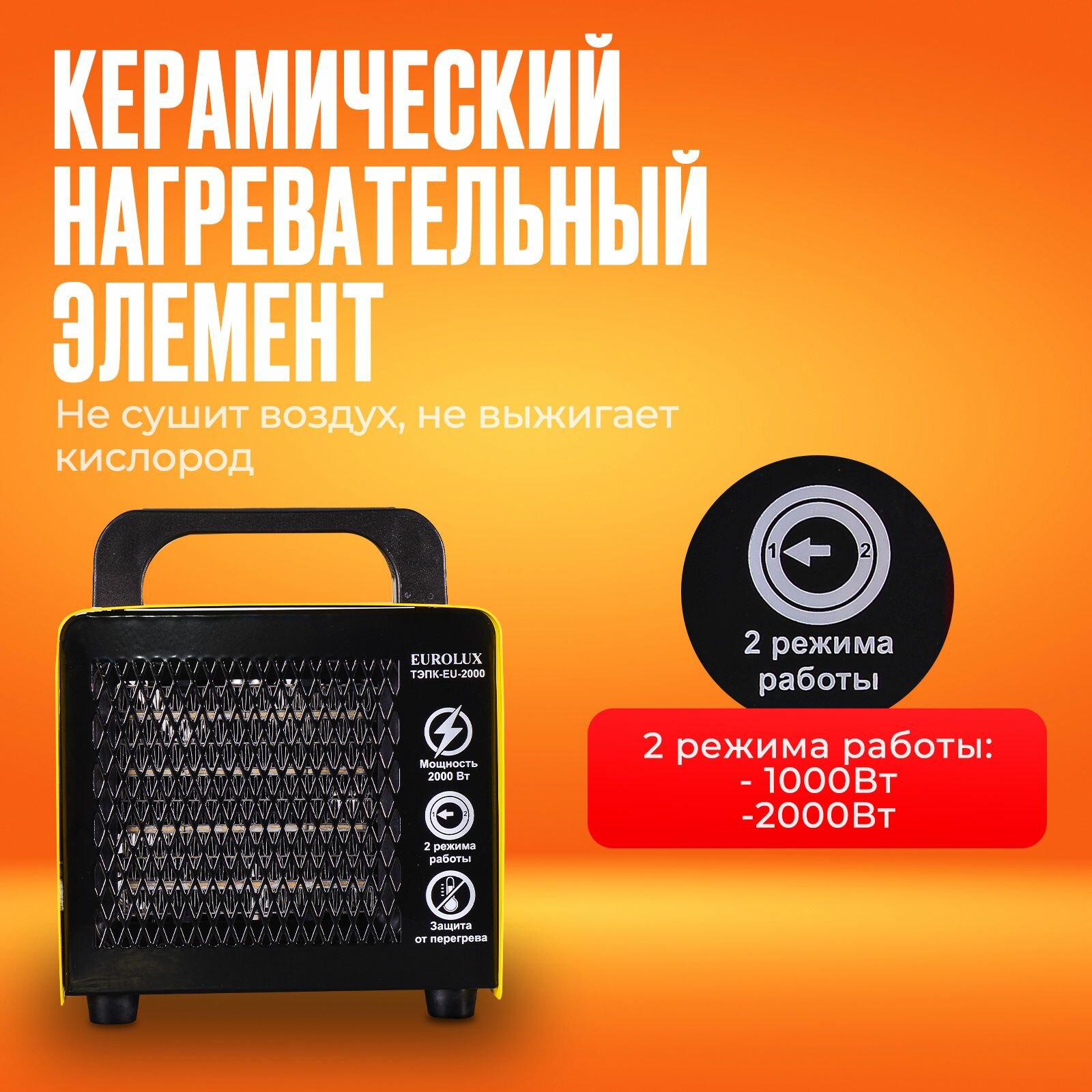 Тепловая пушка Eurolux ТЭПК-EU-2000, электрическая, 220 В, 25/1000/2000 Вт, керамика