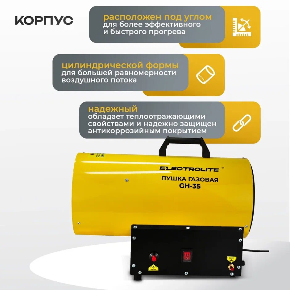 10 цен на Тепловая газовая пушка / пушка газовая ELECTROLITE GH-35 EL (35 кВт , 900 м3, пропан/бутан, обогрев до 350 м2) обогреватель газовый