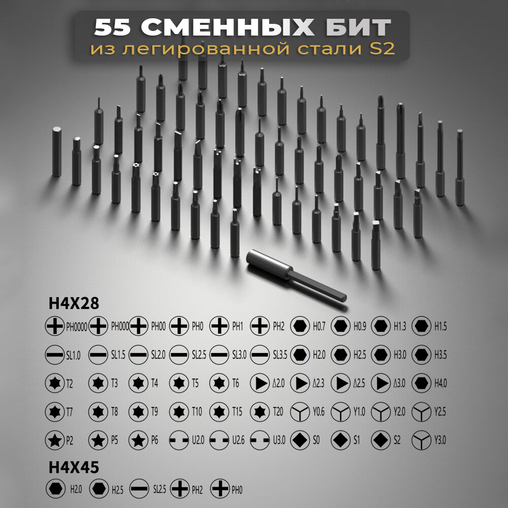 | Комплектация | отвертка; биты 55шт.; кейс для хранения; зарядный кабель USB–USB Type-C; устройство для намагничивания и размагничивания бит |