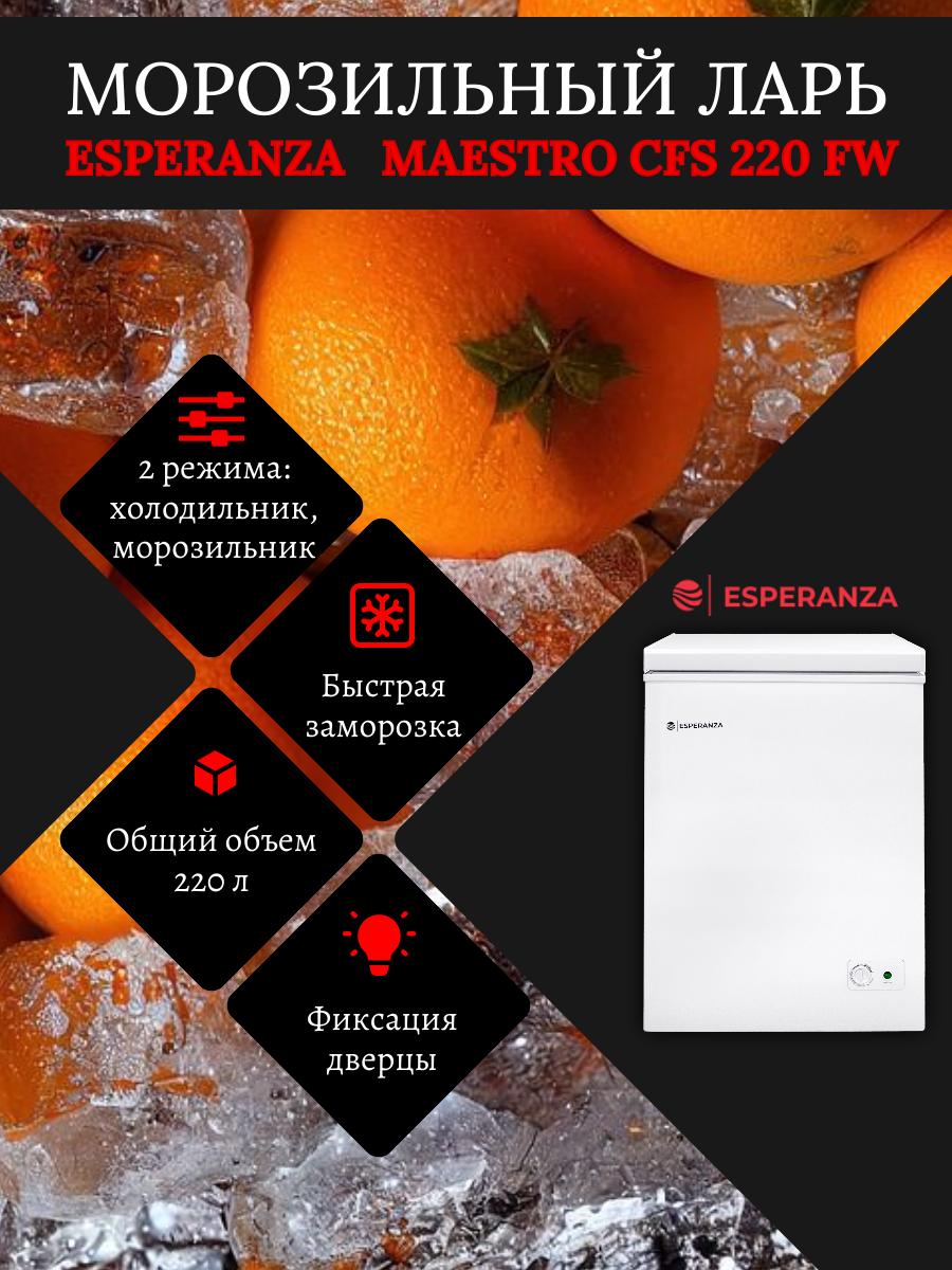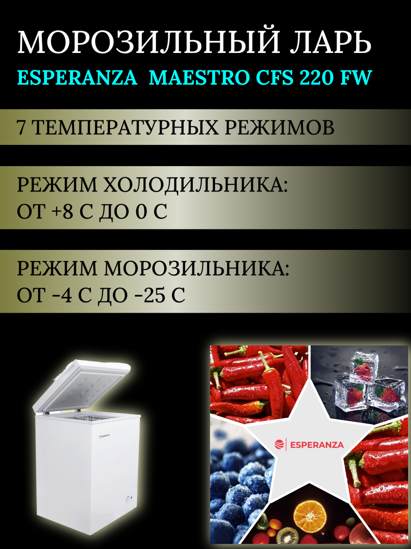 Отзывы на Морозильный ларь камера ESPERANZA Maestro CFS 220 FW, 220 л, с 2-мя корзинами, 2в1 Ларь/Холодильник, 2 года гарантии, белый, 220 л