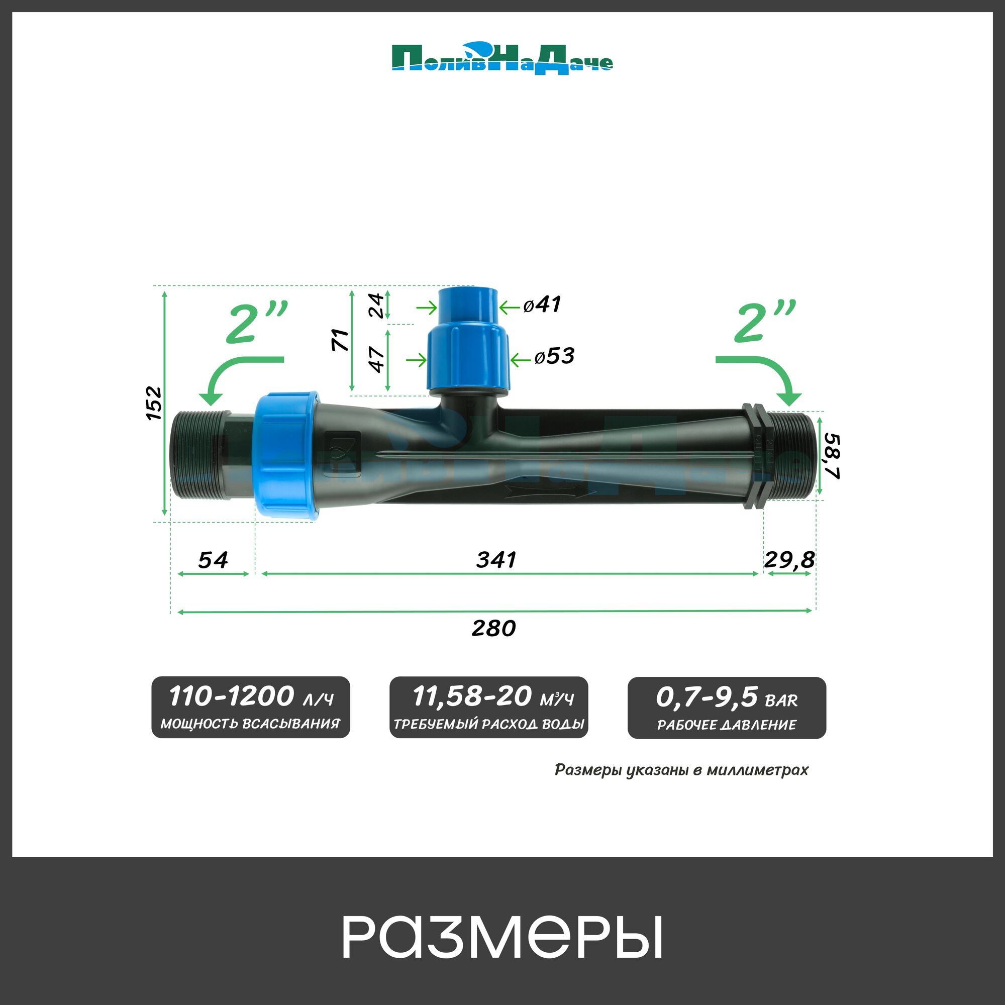 Инжектор Вентури 2" (с подающим шлангом) для внесения удобрений, поток 11.58-20m3/h при 0.7-9.5bar, мощность всасывания 110-1200L/h 3 990 ₽