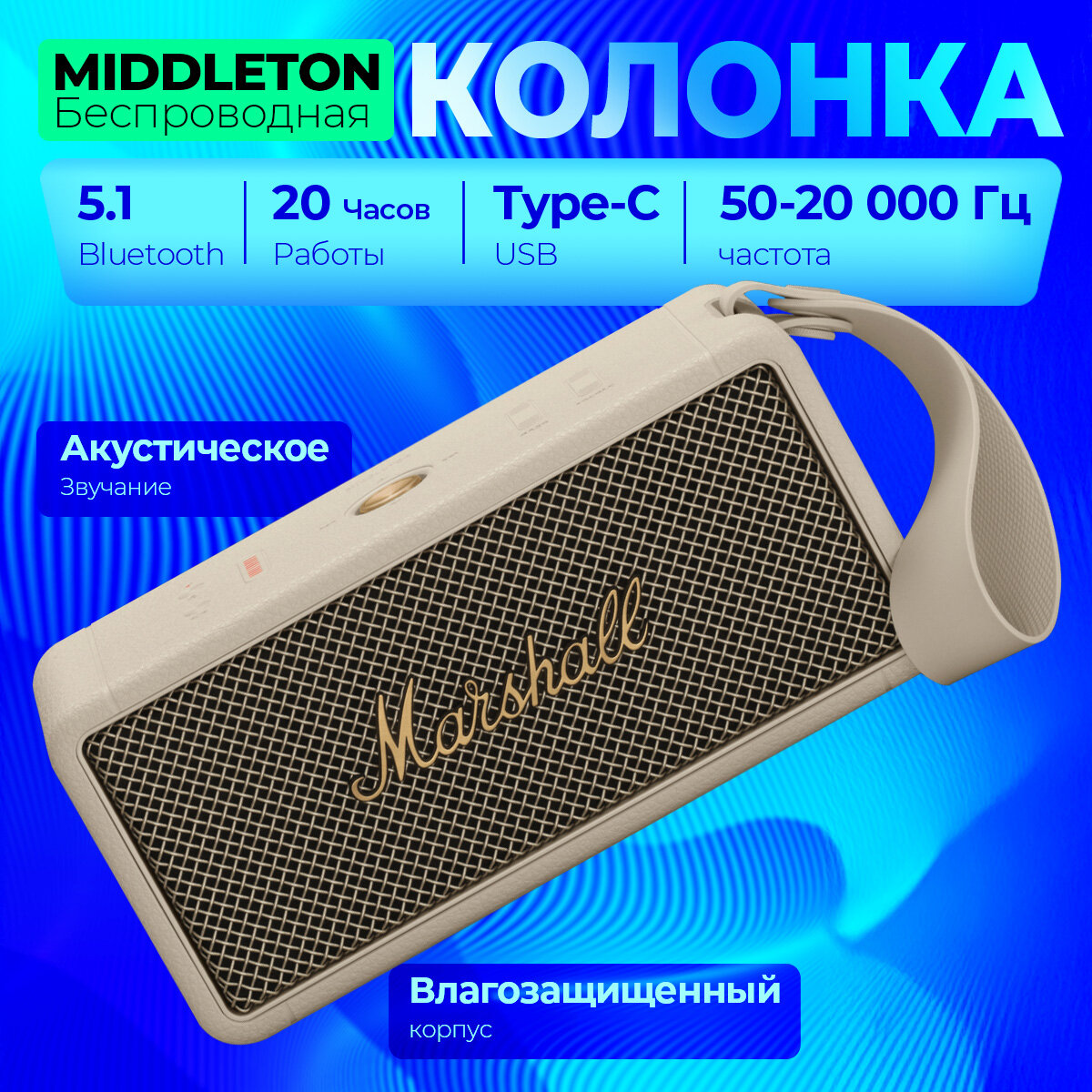 | Дополнительная информация | Комплектация: Акустика Middleton, съемный ремень для переноски, кабель для зарядки USB-C, руководство пользователя |