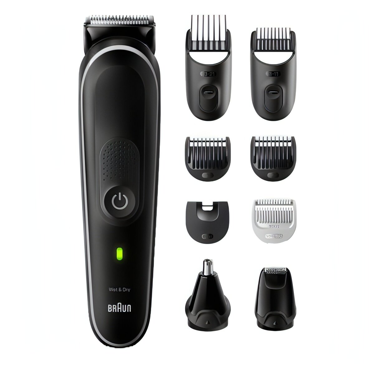 10 цен на Триммер для бороды Braun Series 5 MGK5410 BLK/GREY универсальный, фиксированные и выдвижные гребни, триммер для носа и ушей, насадка для точного стайлинга, серый