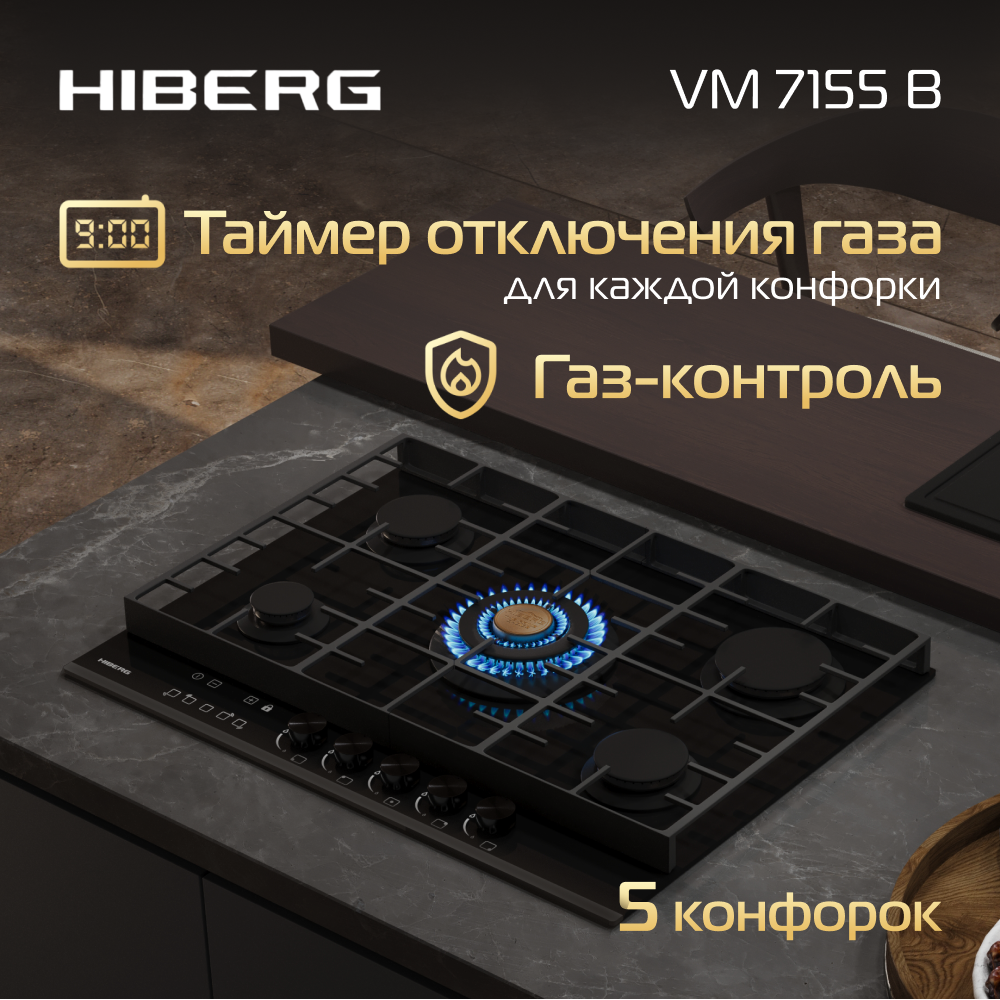 Варочная панель газовая HIBERG VM 7155 B, черное стекло информация: