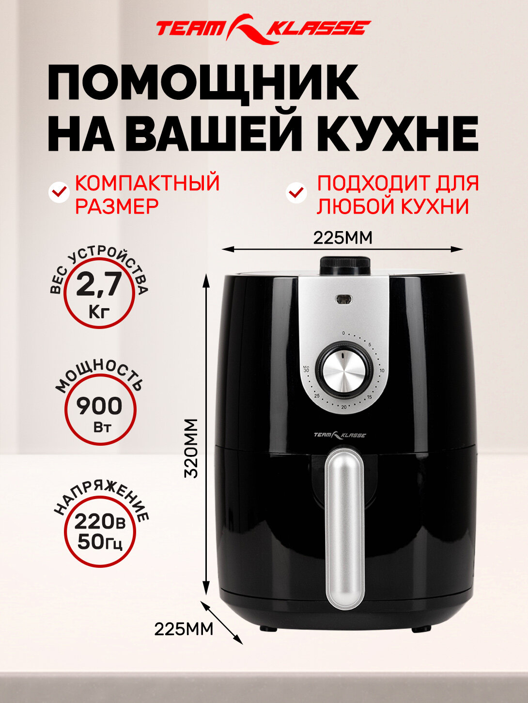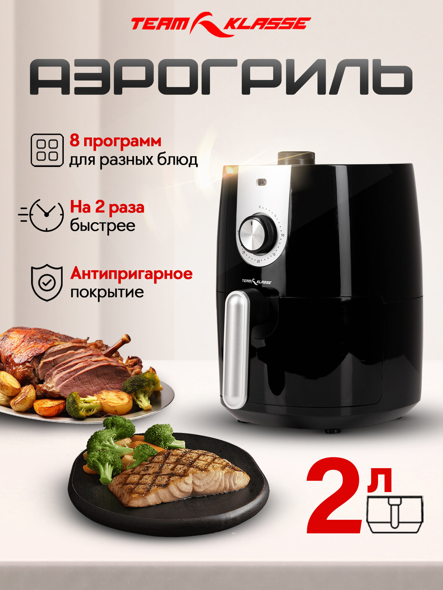 10 цен на Аэрогриль Team Klasse 201M аэрофритюрница, решетка, 900 Вт и 8 программ, объем 2 л, приготовление без масла до 200 градусов, с антипригарным покрытием, таймер, цвет черный