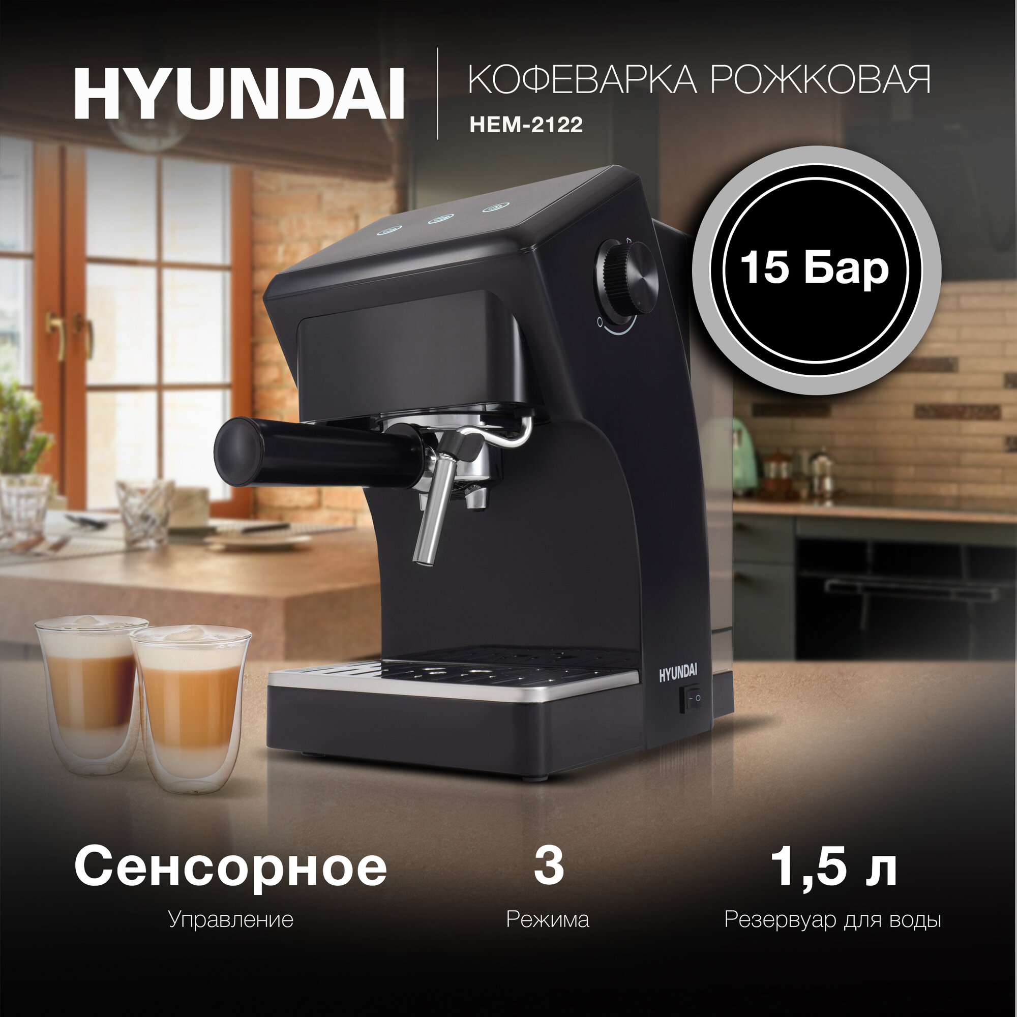 Кофеварка рожковая Hyundai HEM-2122, 3 режима, 1.5 л, черный информация: