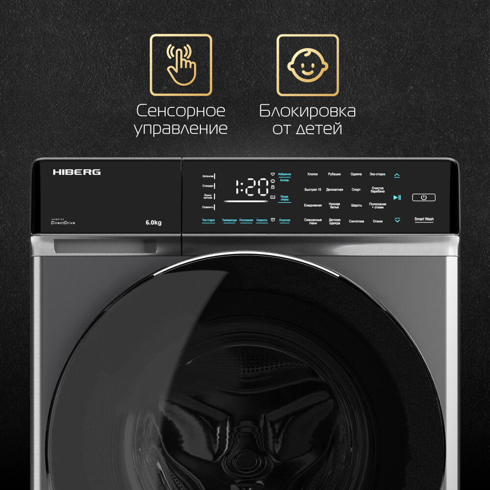 Стиральная машина HIBERG i-DDQ9 - 612, инверторная, 6 кг загрузка, 1200 об/мин, 16 программ, Smart wash, таймер, прямой привод