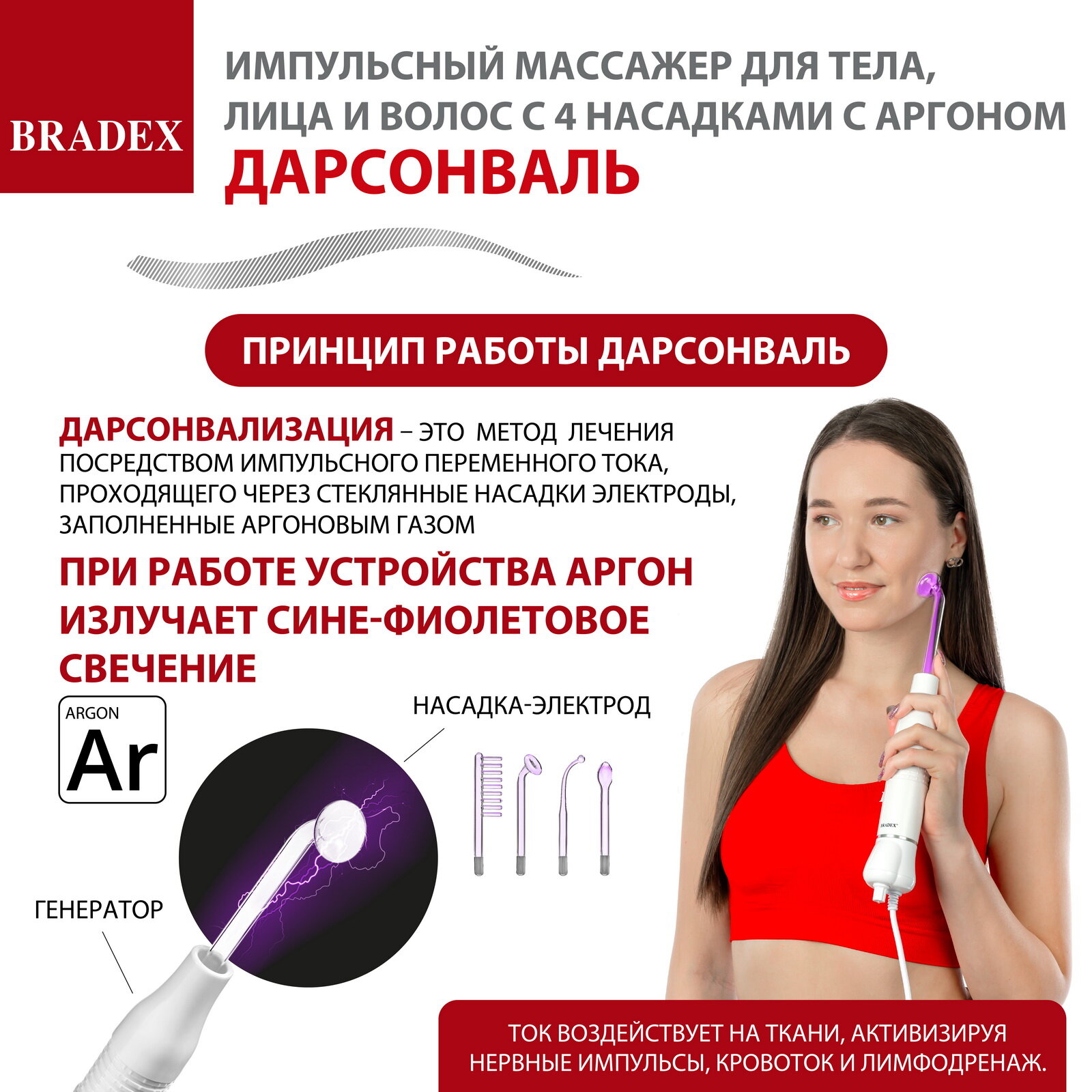 Дарсонваль импульсный массажер Bradex KZ 1174, для лица, тела и волос, с 4 насадками, с Аргоном, белый информация: