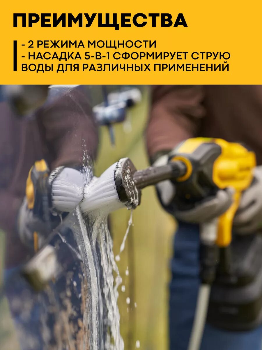 | Подробная комплектация | АКБ 18 В 4 А.ч. -1 шт; зарядное устройство - 1 шт; cтруйная трубка 57 см - 1 шт; насадка 5-в-1 - 1 шт; шланг забора воды - 1 шт; пенник - 1 шт; фильтр - 1 шт; адаптер для подключения шланга - 1 шт; ведро 20 литров - 1 шт; щетка - 1 шт |