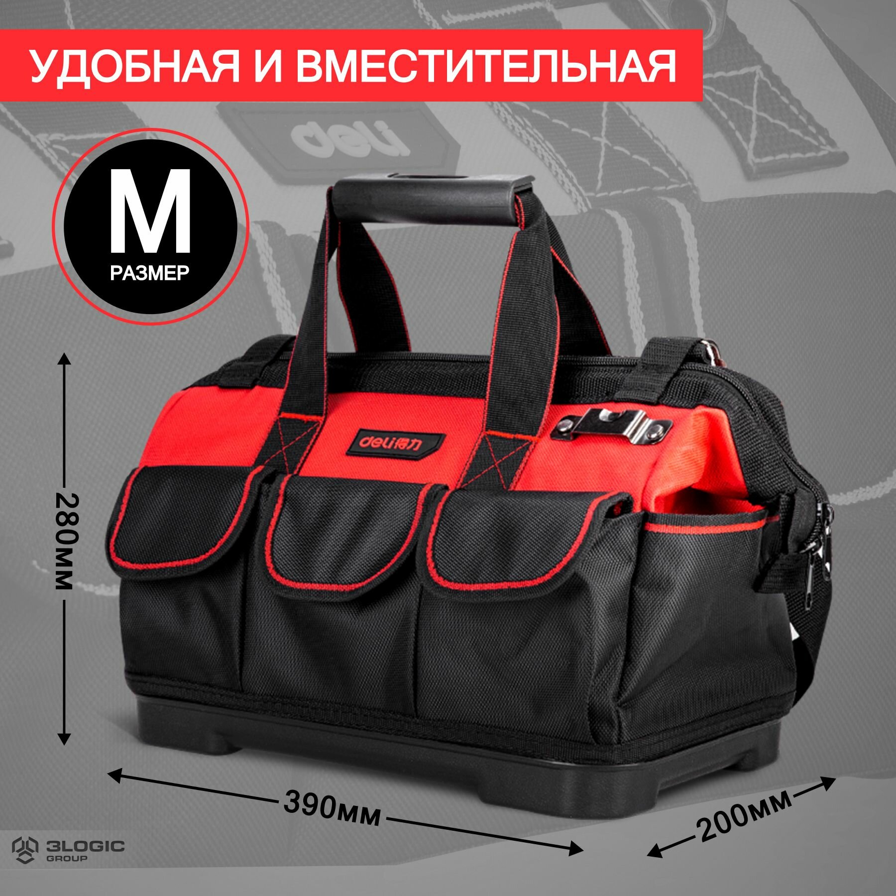 Отзывы на Сумка для инструментов с жестким пластиковым дном Deli DL430316 390 x 200 x 280мм (16 карманов, плечевой ремень, ткань Оксфорд 1680D)
