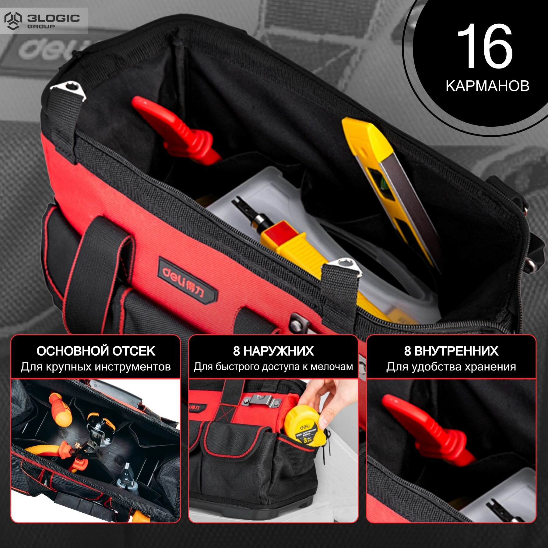 Сумка для инструментов с жестким пластиковым дном Deli DL430316 390 x 200 x 280мм (16 карманов, плечевой ремень, ткань Оксфорд 1680D) информация: