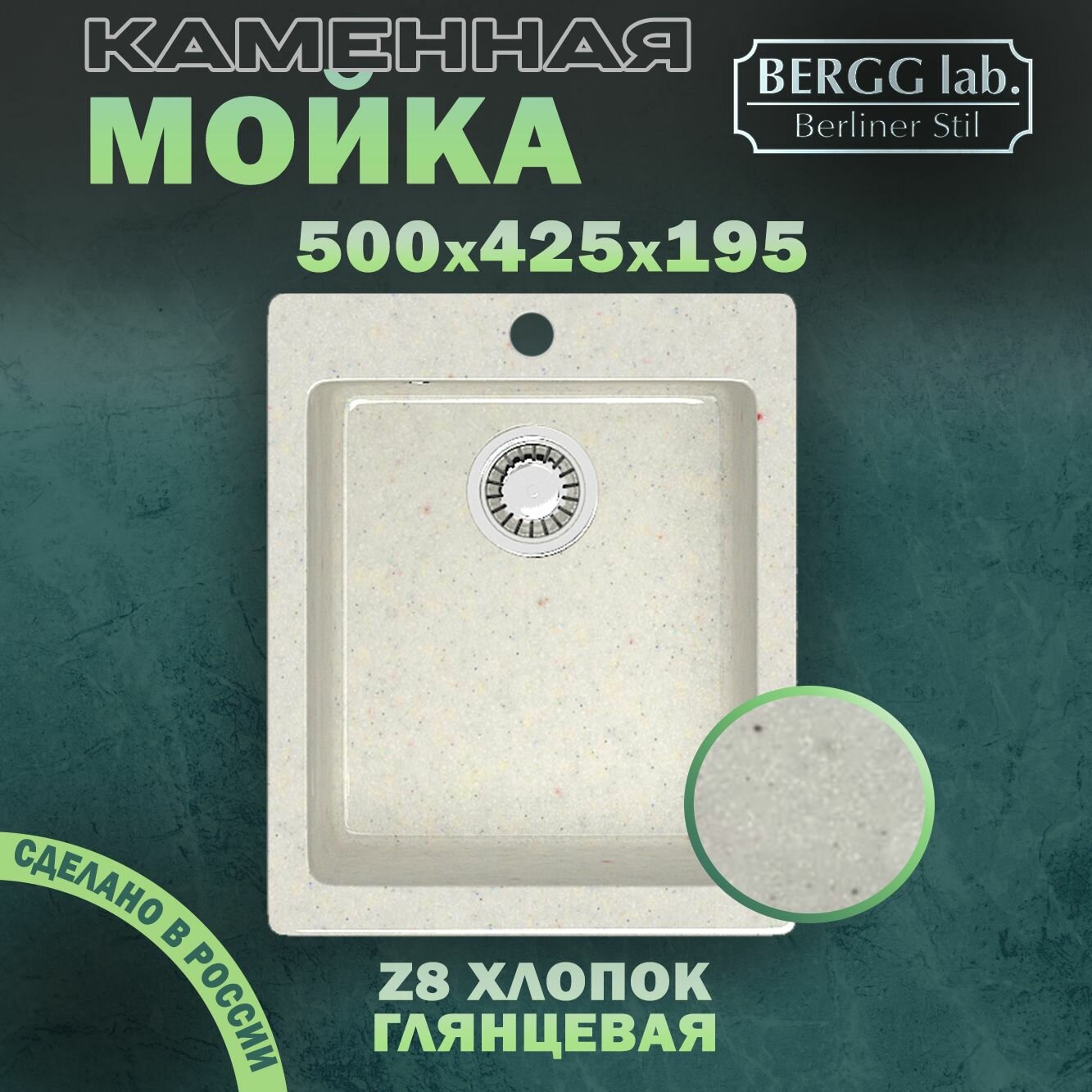 Мойка Раковина для кухни каменная врезная глянцевая Z8 без сифона, цвет хлопок с блестками, 50*42,5*19,5 см BERGG ZETT lab 7 082 ₽