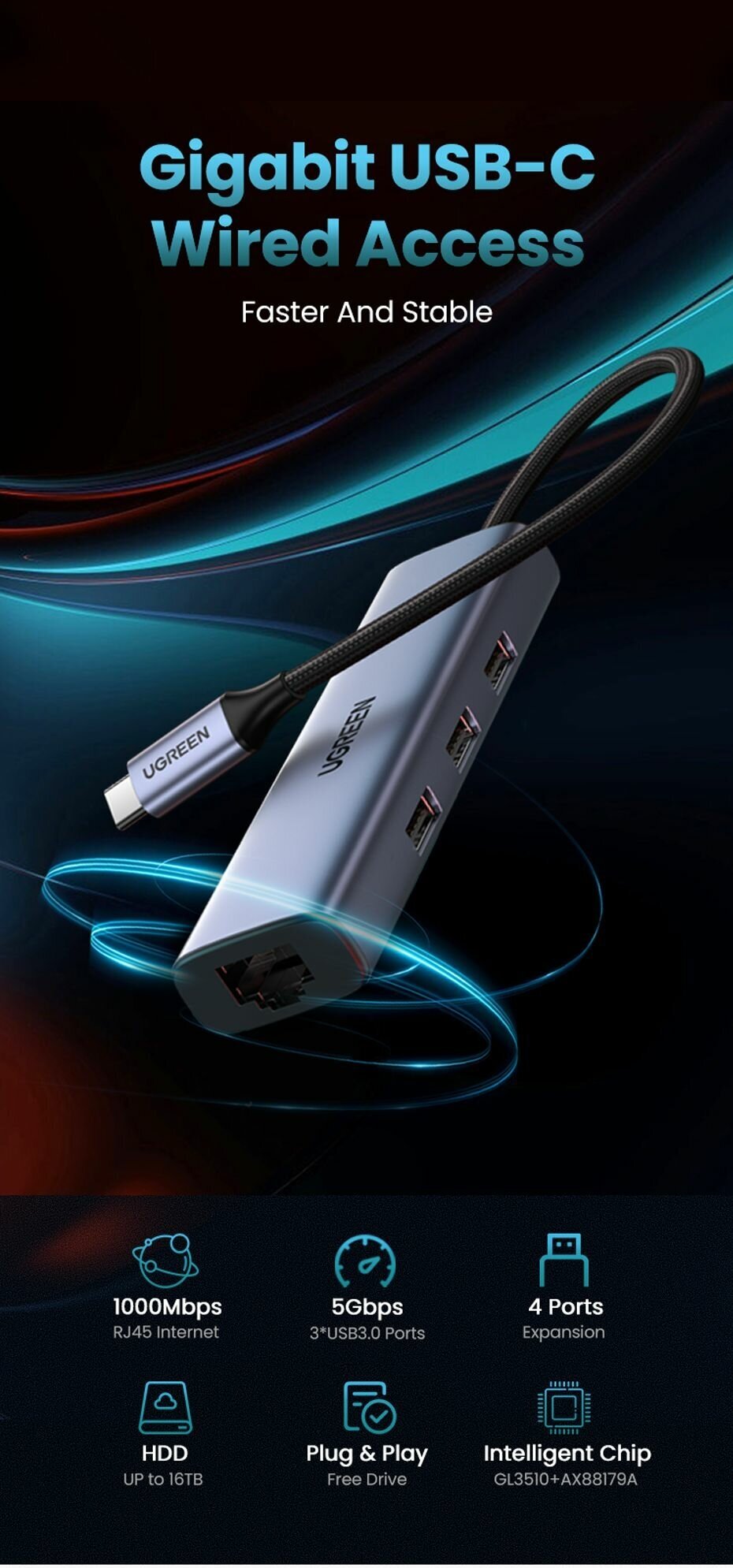 Мульти Хаб UGREEN CM475 (60600) USB-C to 3×USB3.0 Hub+RJ45 Ethernet Adapter без порта питания серый информация: