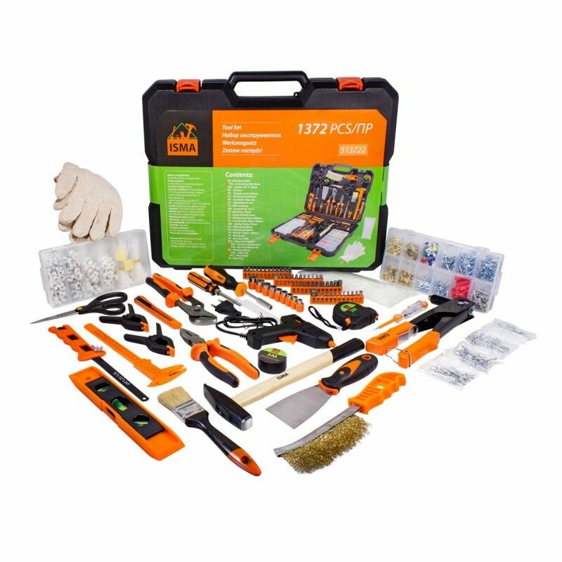 Отзывы на Набор инструментов 1372пр.1/4''(6-гр.) (5-13мм, шарнирно-губцевый, биты, молоток, рулетка, уровень, клеевой пистолет, расходник) ISMA-513722