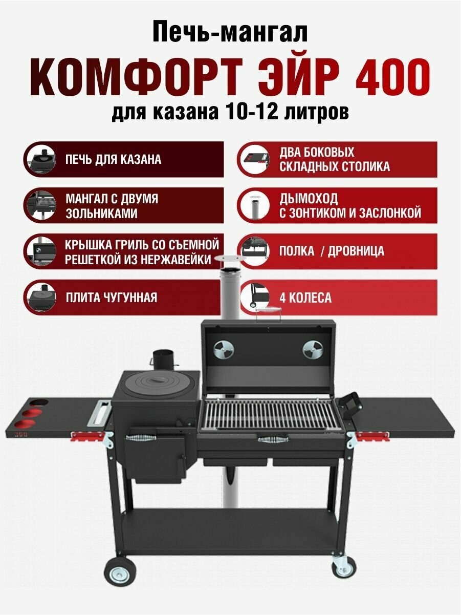 Печь-мангал Grillver "Искандер 400 комфорт эйр" с крышкой гриль и решеткой из чугуна, дополнительно с чугунной плитой, для казана 12 л (сталь 3 мм)