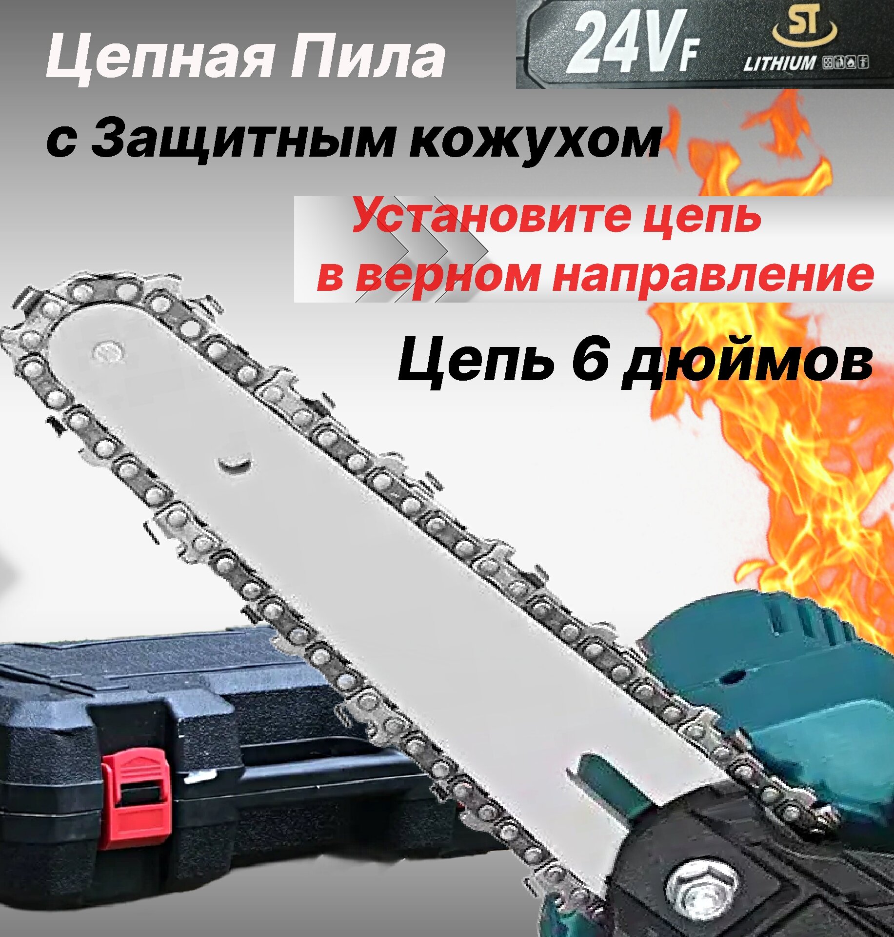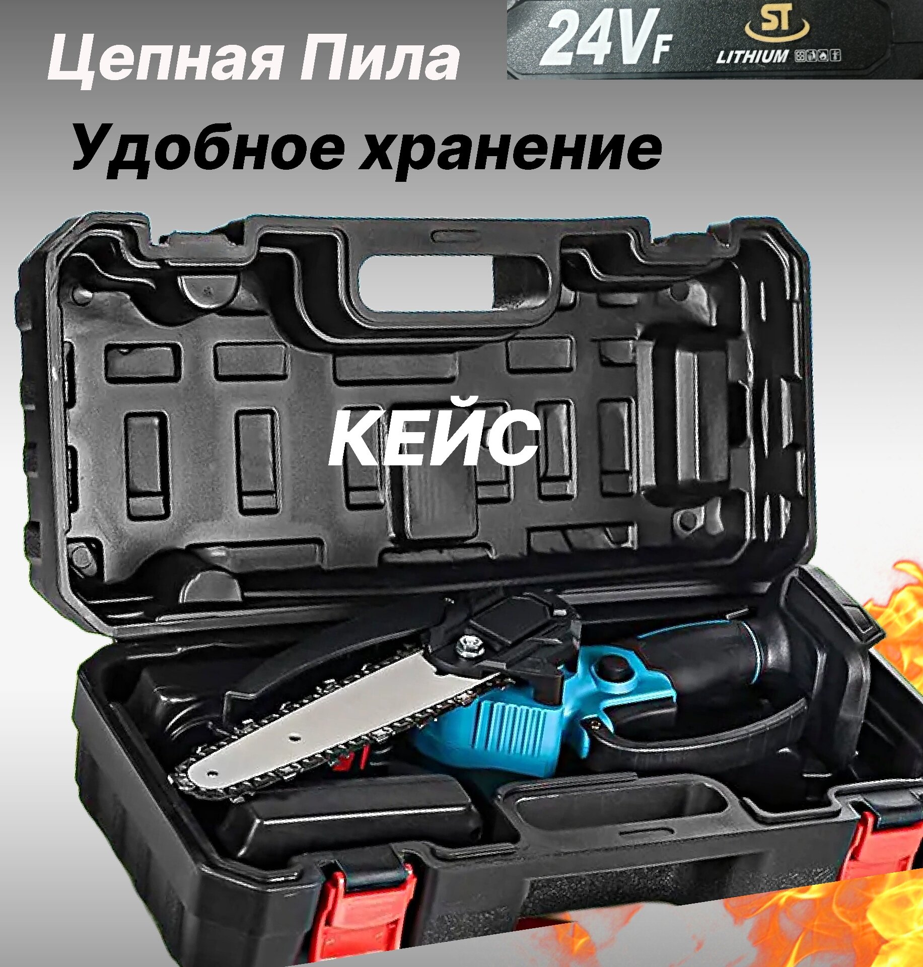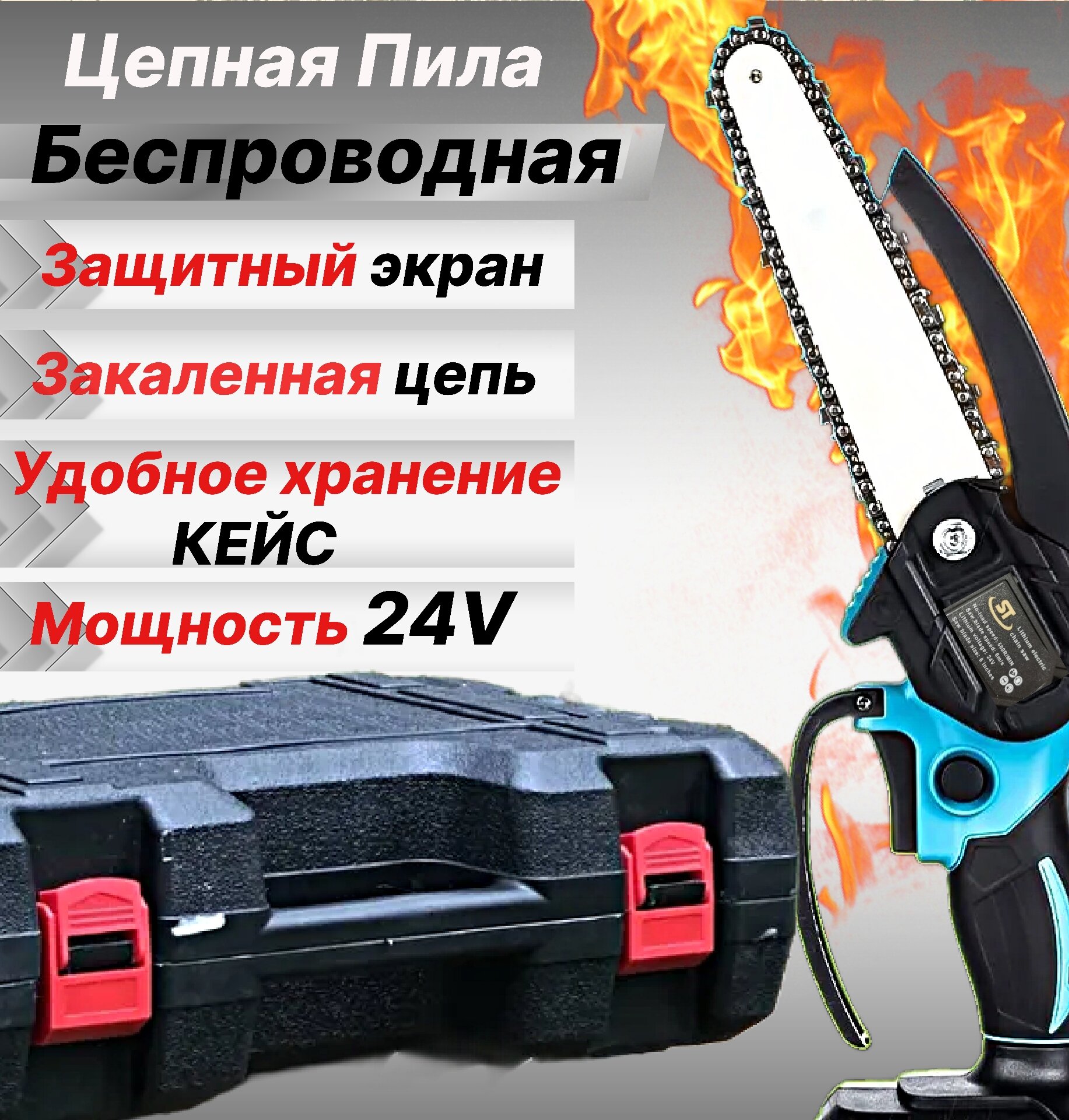 Цепная аккумуляторная пила в кейсе/ Электропила ручная 24V / Мини пила для строительства и садоводства / Кусторез Сучкорез / Режущий инструмент информация: