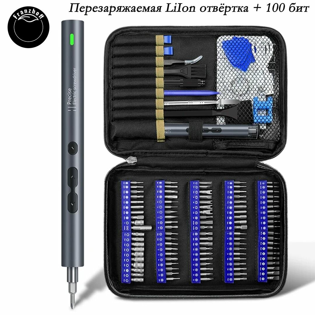 Электрическая реверсивная отвёртка Franzhoff с набором прецизионных бит (120 предметов) и инструмента, для ремонта электроники и не только, в удобном кейсе - сумке с ручкой информация: