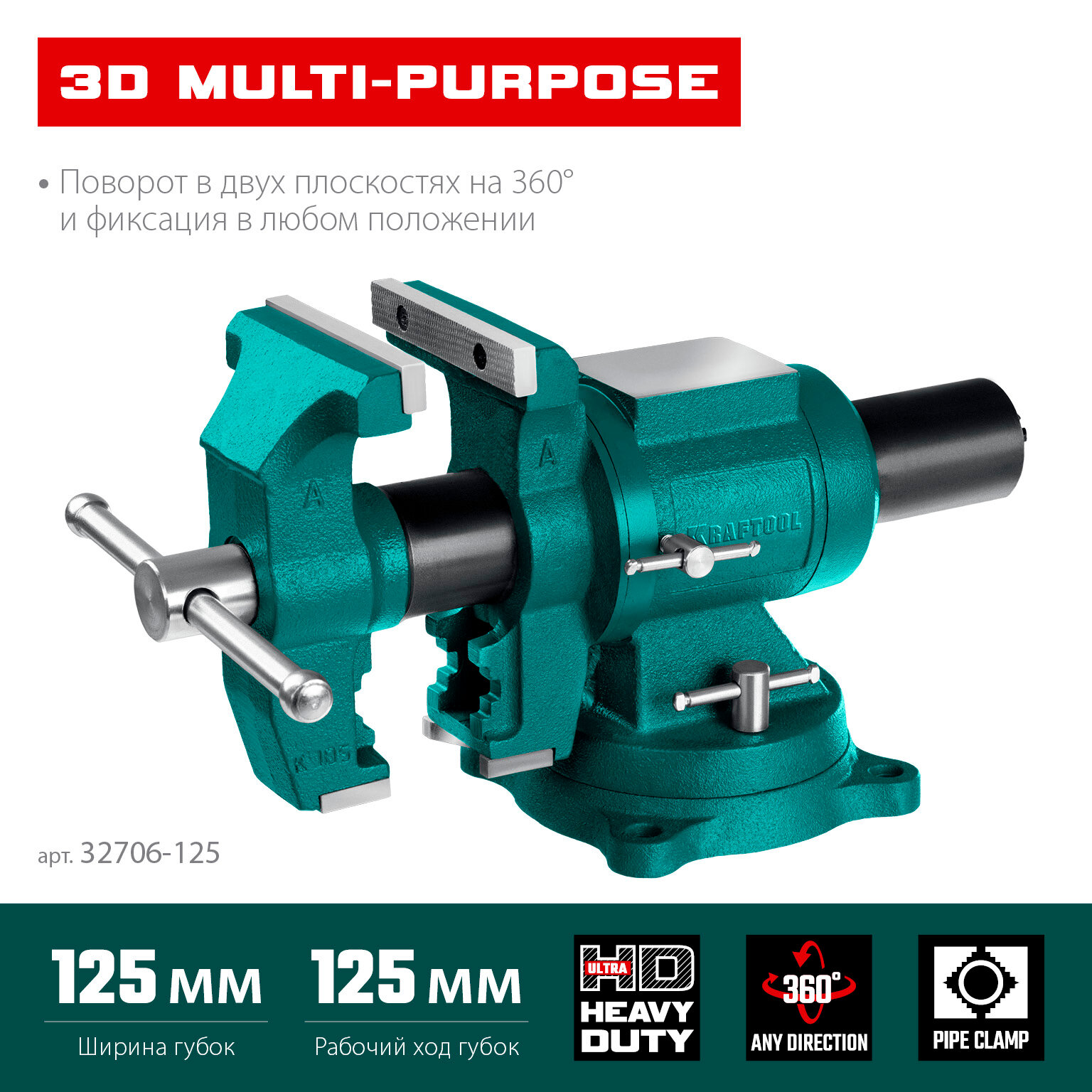 KRAFTOOL 3D Multi-Purpose, 125 мм, Чугунные слесарные тиски (32706-125)