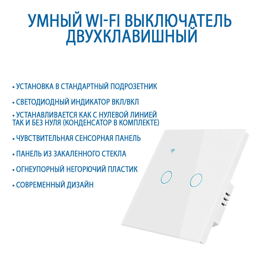 Умный выключатель с Алисой, сенсорный выключатель с Wi-Fi двухклавишный белый, подключение с нулем и без нуля, закаленное стекло