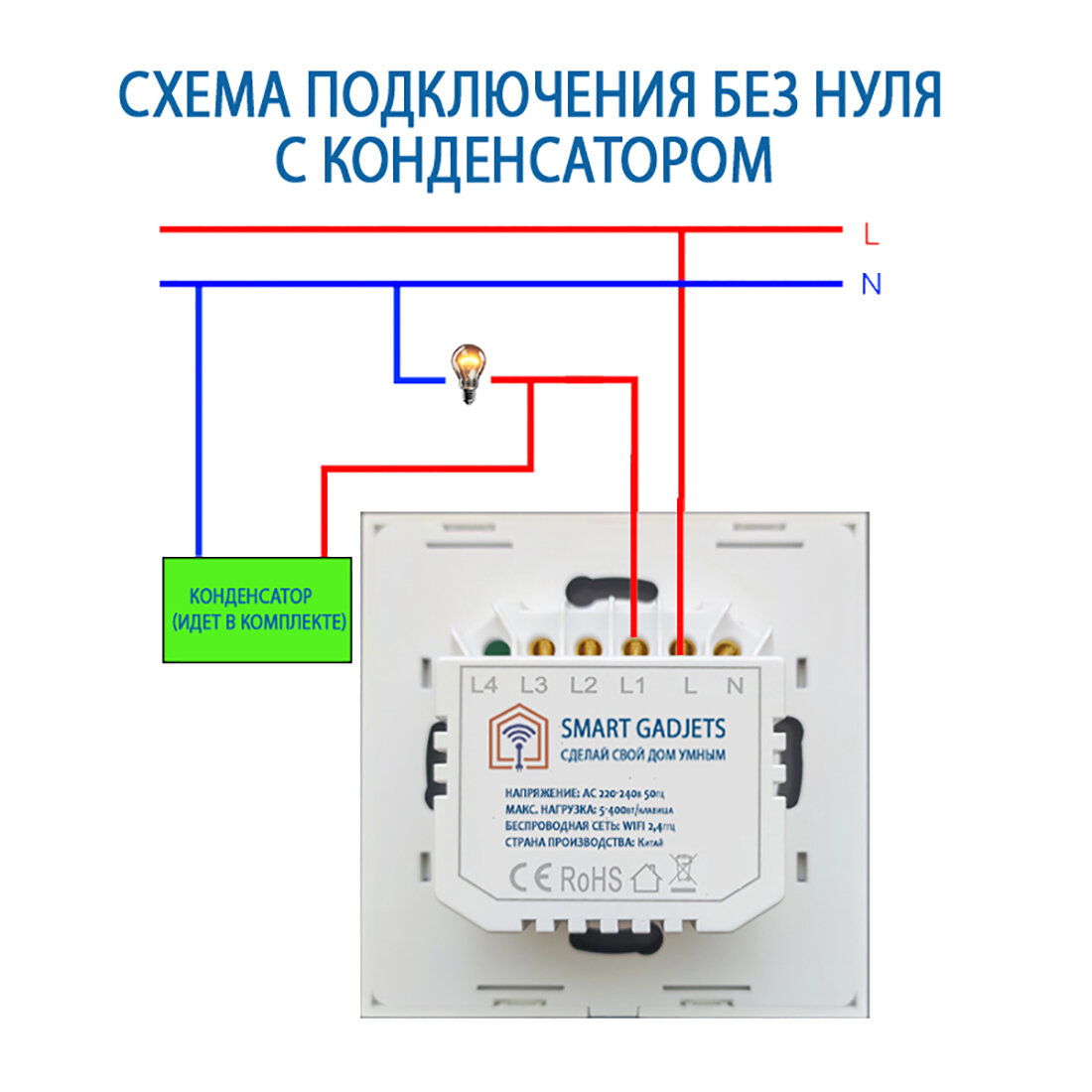 Умный сенсорный Wi-Fi выключатель Tuya (белый) - универсальный без нуля и с нулем - работает с Алисой