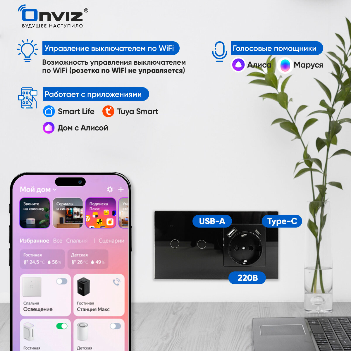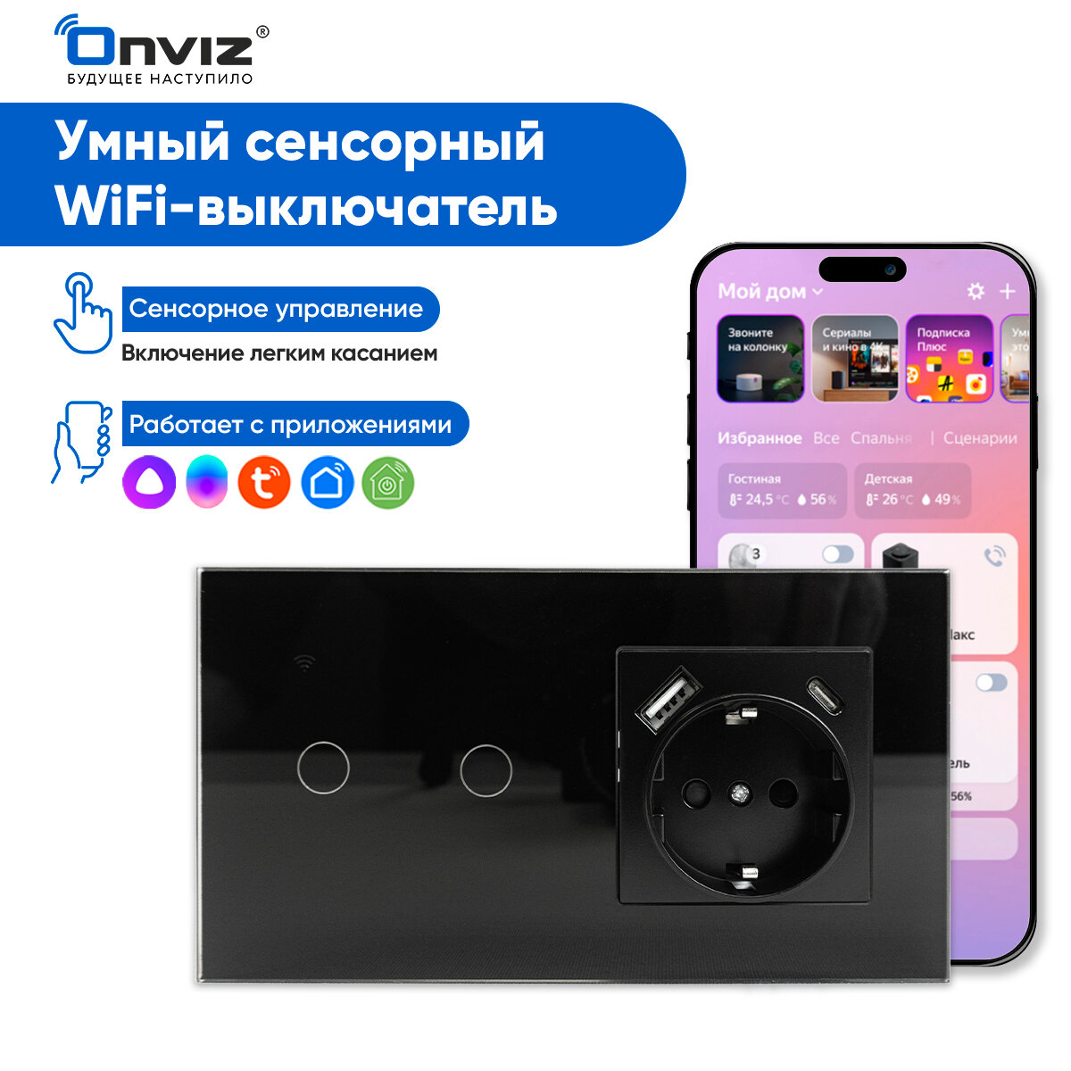 Отзывы на Умный сенсорный Wi-Fi выключатель с Алисой (черный) 2 клавиши с розеткой USB Type-C, универсальный без нуля и с нулем
