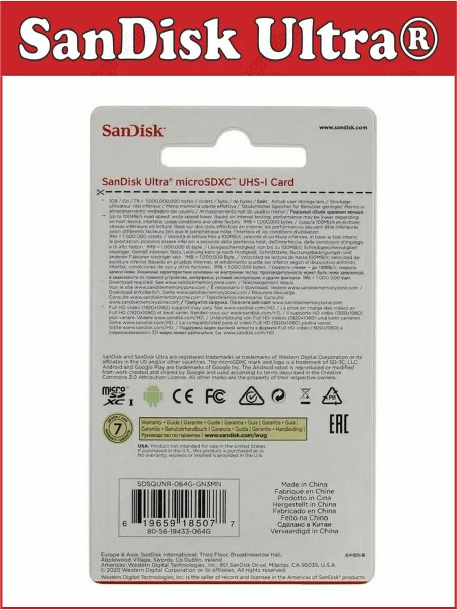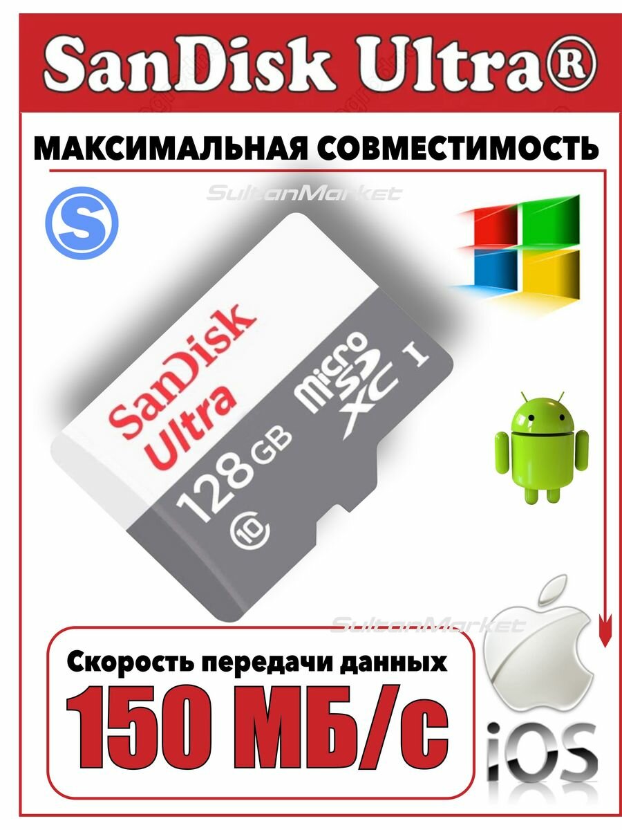 Карта памяти SanDisk Ultra 128GB microSD без адаптера, белая информация: