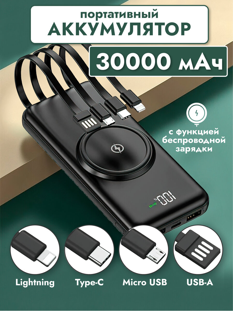 Внешний аккумулятор Power Bank 30000mAh с беспроводной зарядкой и встроенными кабелями, черный информация:
