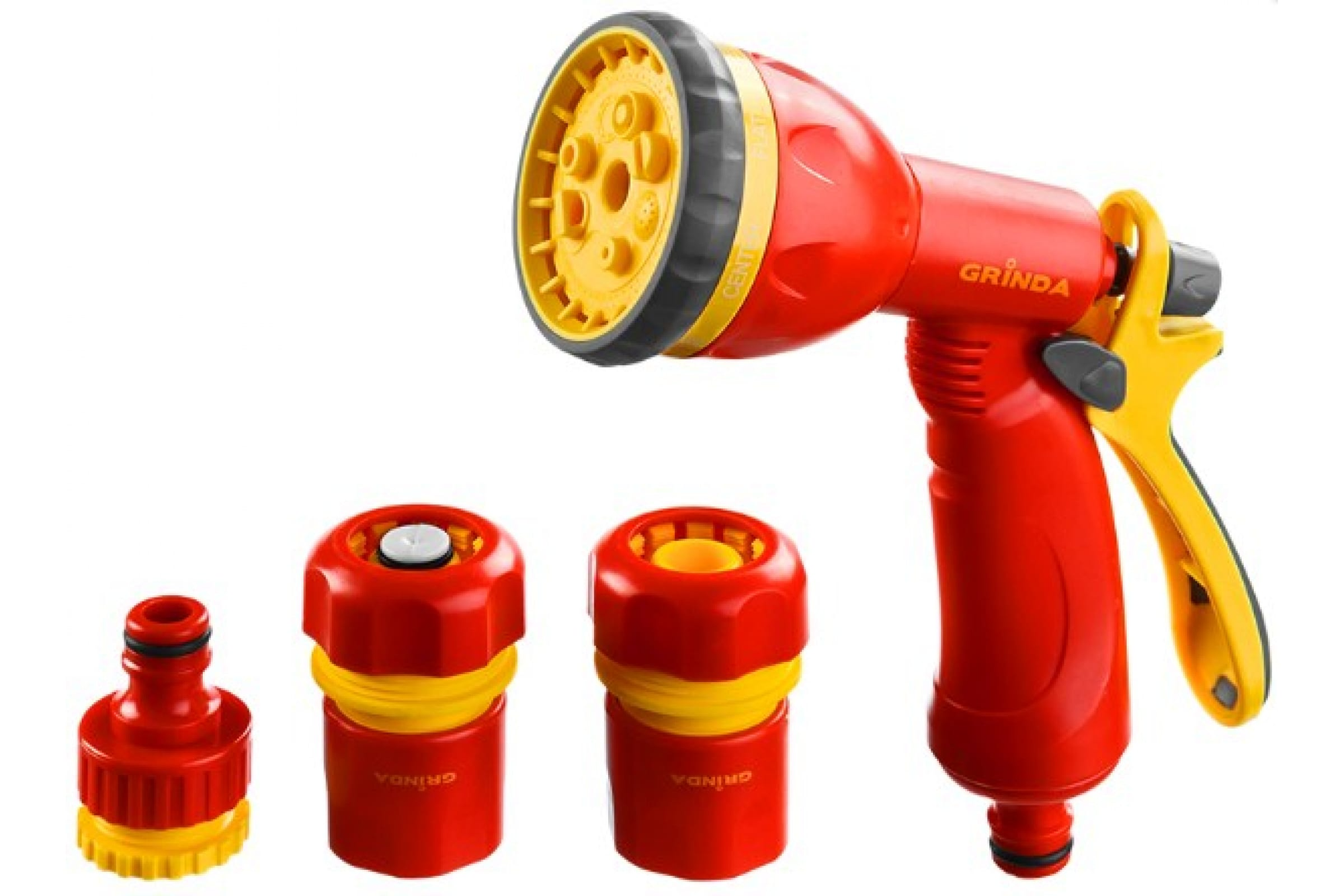 Набор GRINDA поливочный: Распылитель пистолетный 8 позиционный, соединитель 1/2", соединитель 1/2" с автостопом, адаптер внешний 1/2"-3/4" информация: