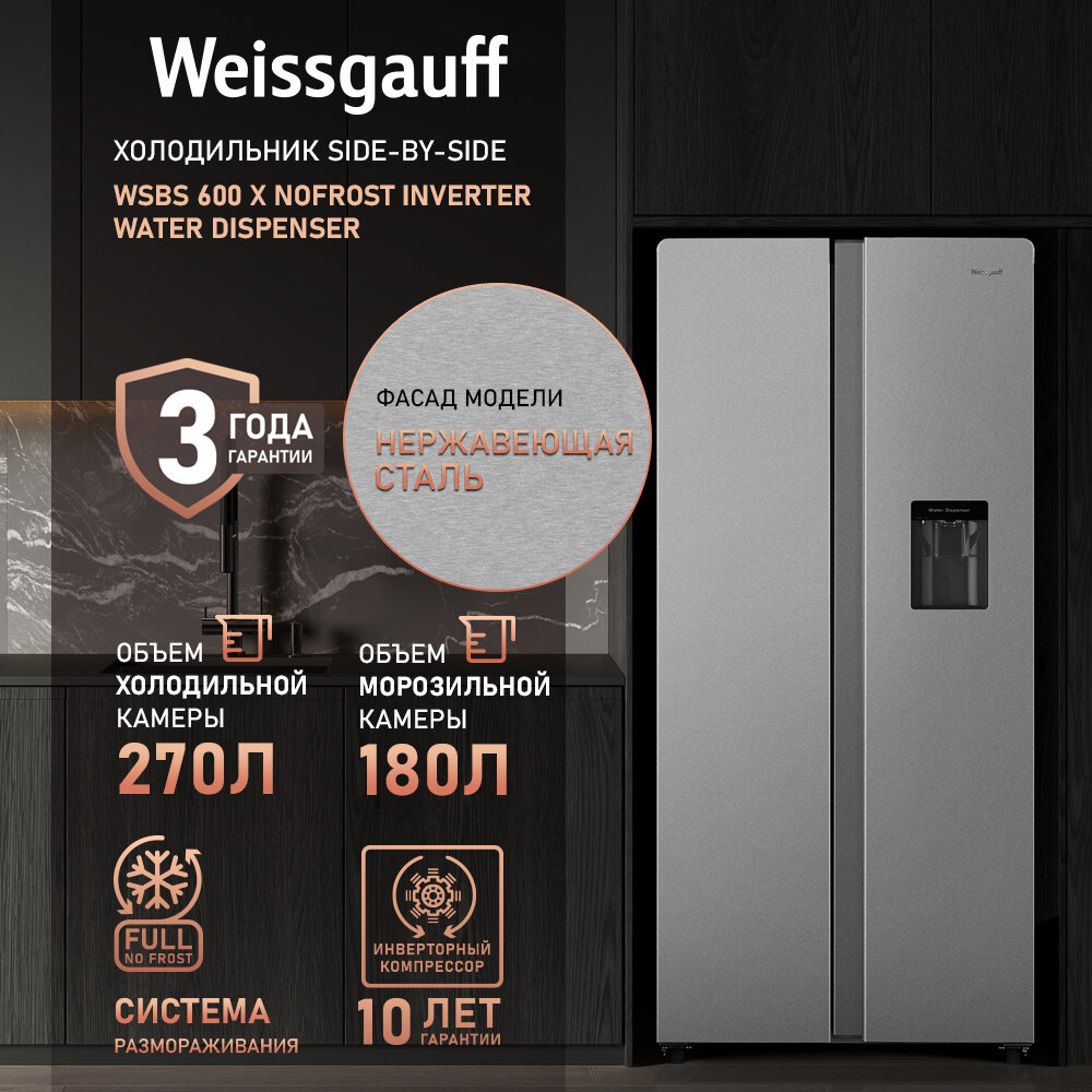 10 цен на Отдельностоящий холодильник с инвертором и подачей воды Weissgauff WSBS 600 X NoFrost Inverter Water Dispenser Side by Side двухдверный ,3 года гарантии, Мощность замораживания 12 кг сутки, Объём 500 л, Сенсорное управление, Суперзаморозка, A+