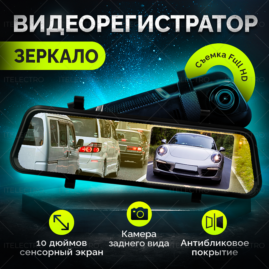 Автомобильный видеорегистратор "Full HD" с зеркалом заднего вида и двумя камерами / Сенсорный дисплей / G-сенсор