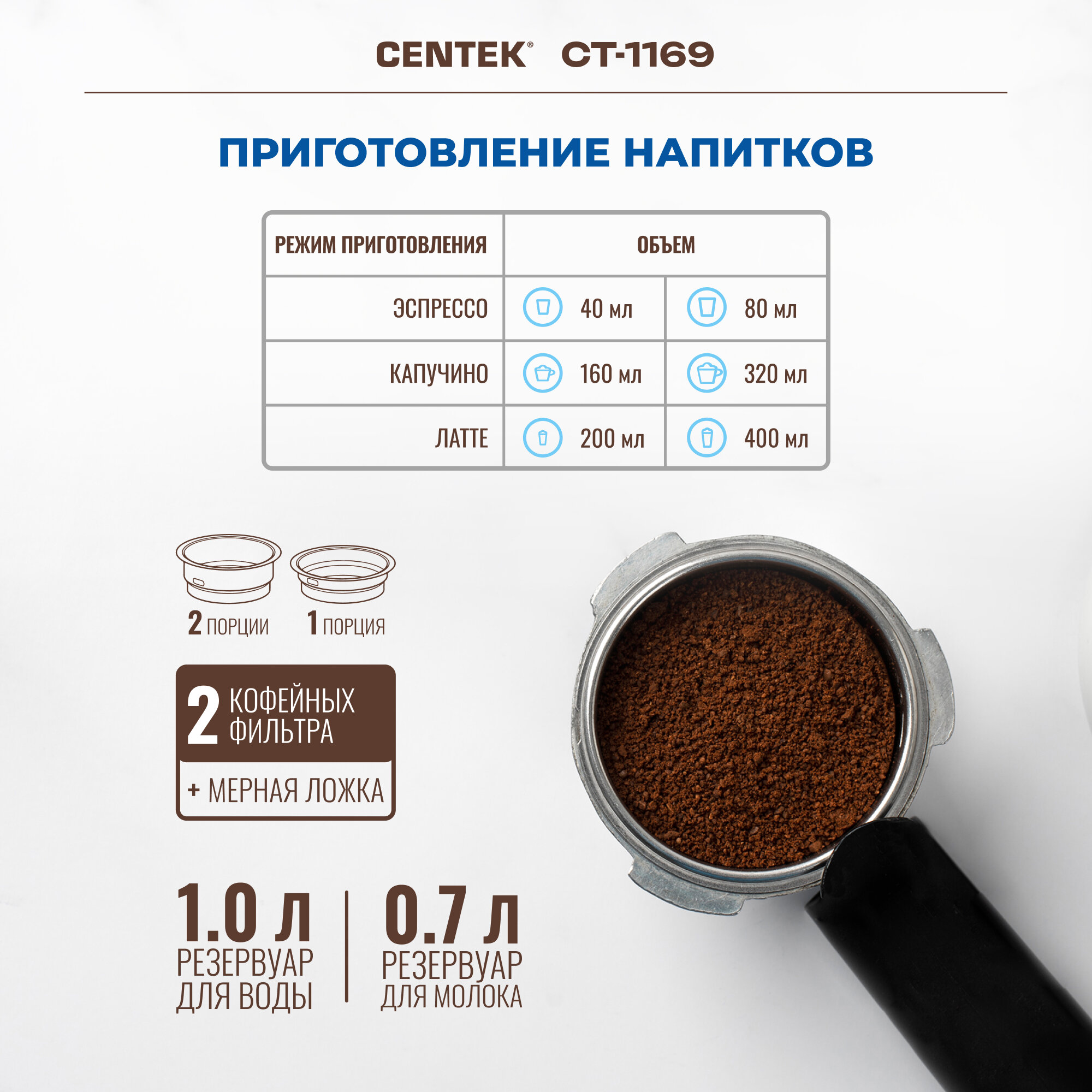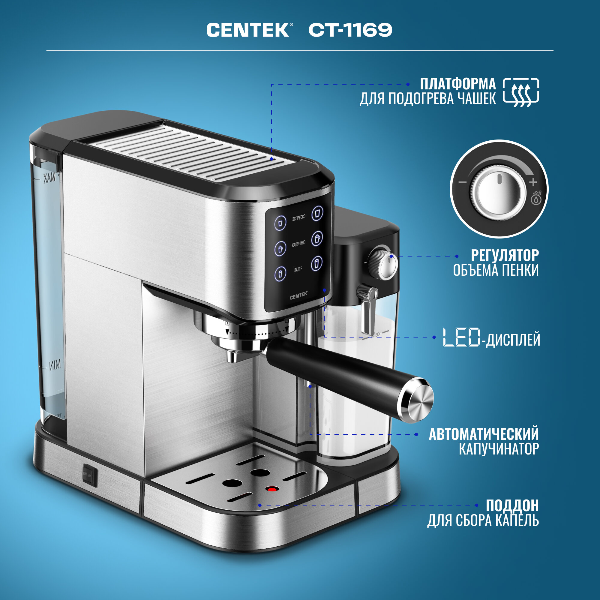 10 цен на Кофемашина полуавтоматическая c автокапучинатором CENTEK CT-1169: 1450Вт, 3в1, сенсорный LED дисплей, кофеварка рожковая