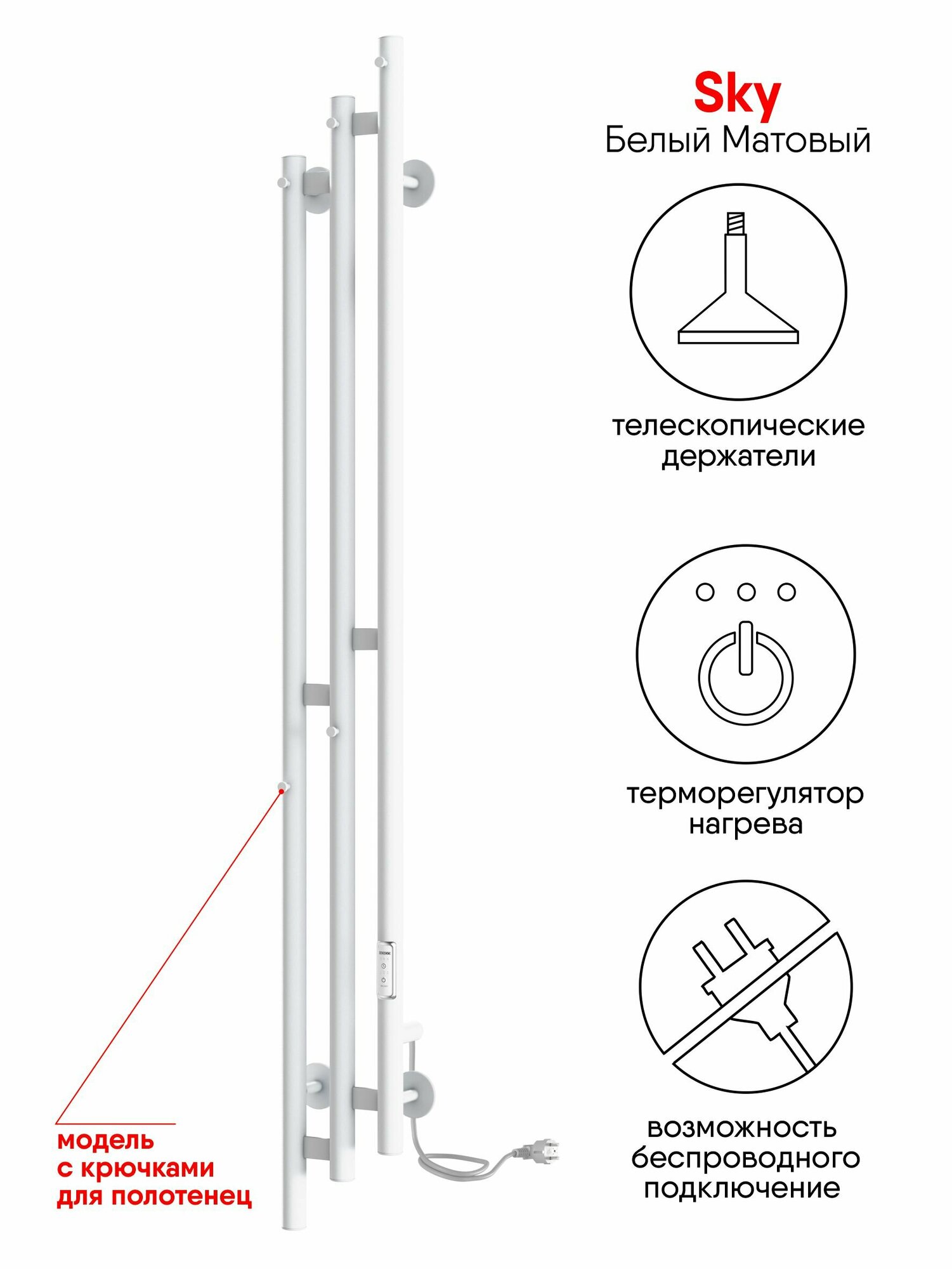 Полотенцесушитель электрический INDIGO Sky 150/17 таймер, скрытый провод справа, Белый матовый информация: