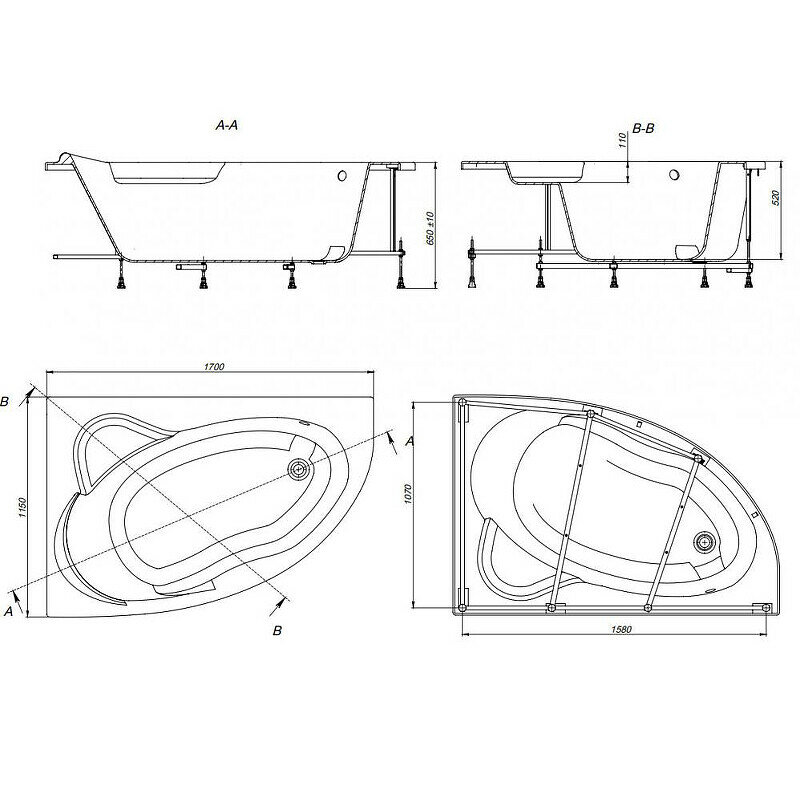 Акриловая ванна ARAGUT Кама 160х70 прямоугольная, в комплекте с каркасом, белая
