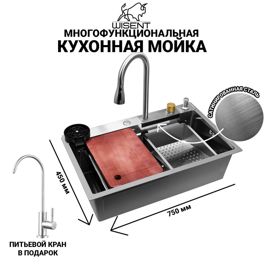 Многофункциональная мойка для кухни с водопадом и душем 75*45 Wisent WG37545-S информация: