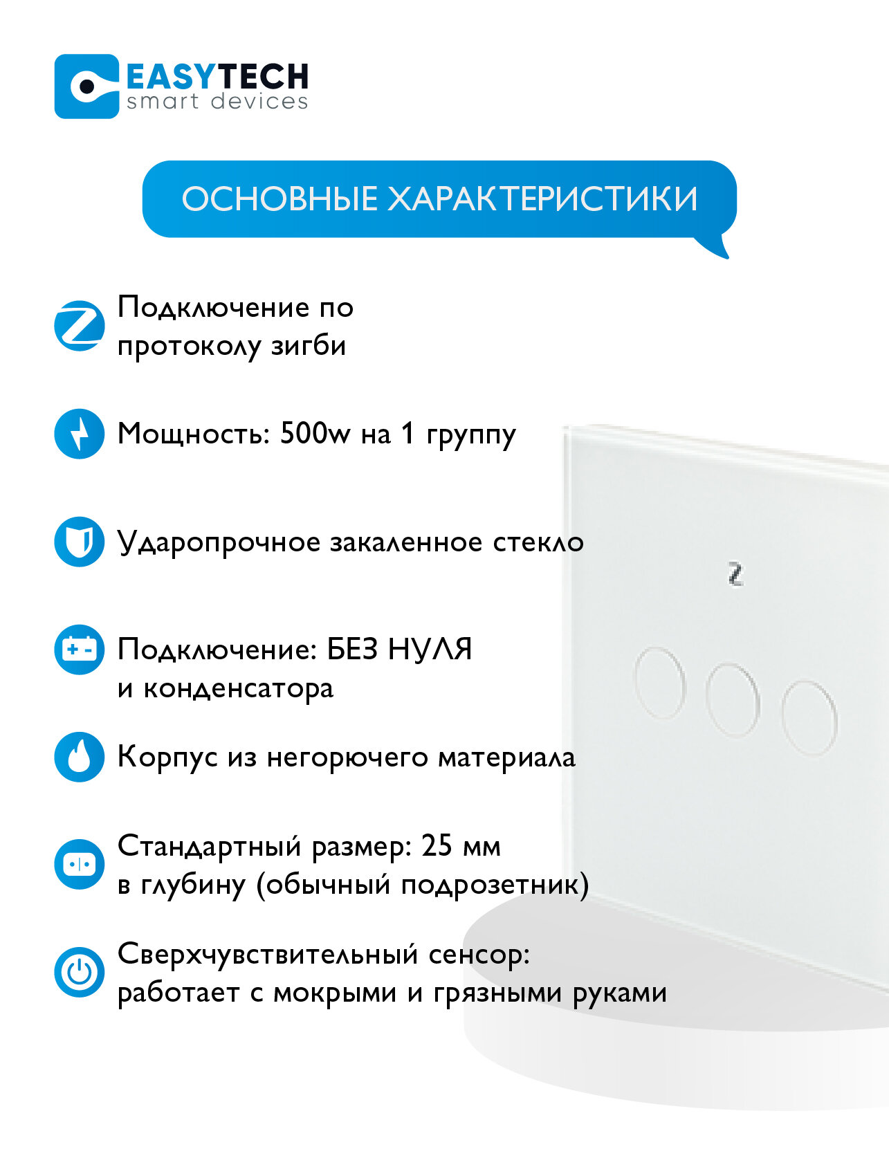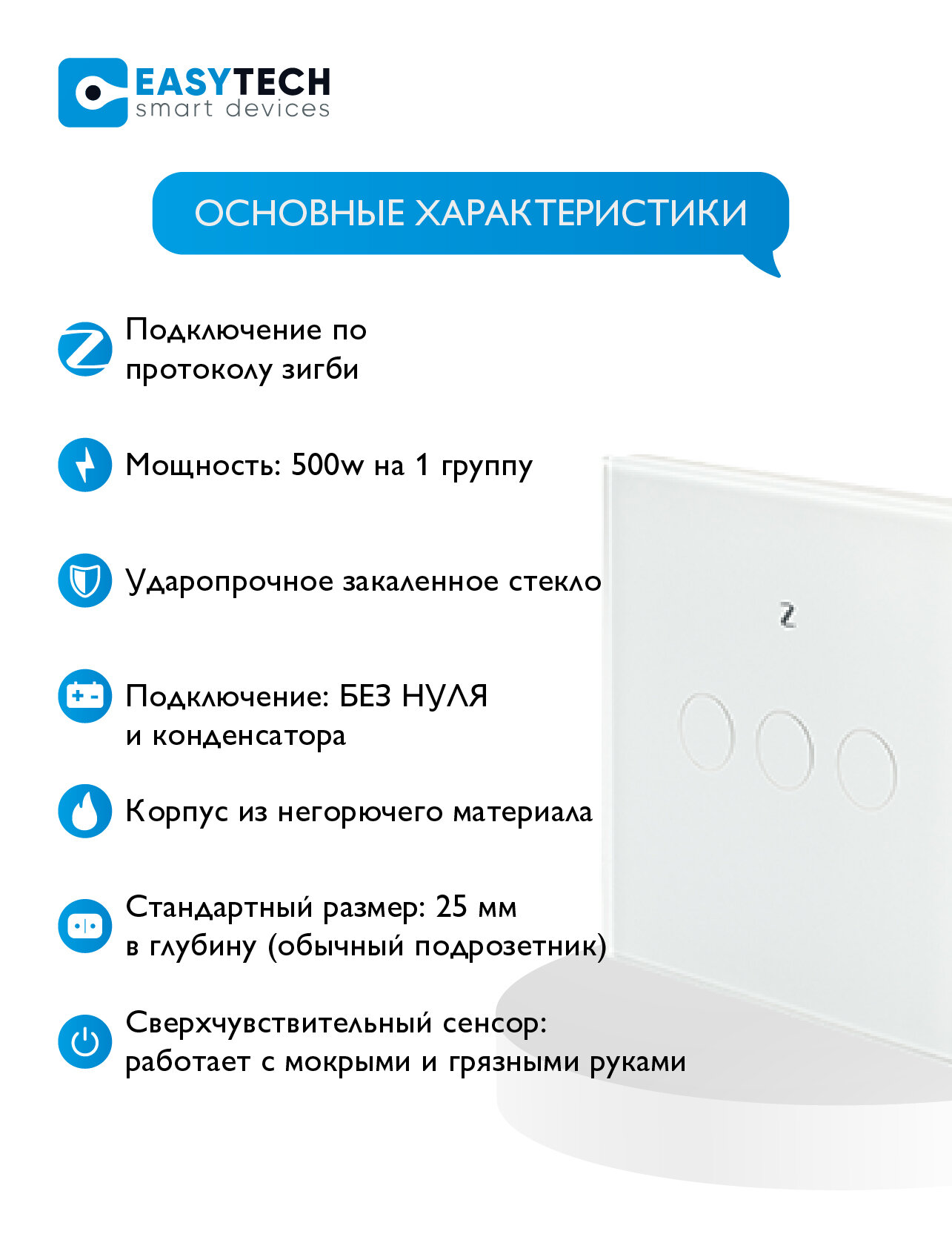 Умный сенсорный Zigbee выключатель с Алисой трехклавишный без нуля на 1500 W Tuya, белый без конденсатора информация:
