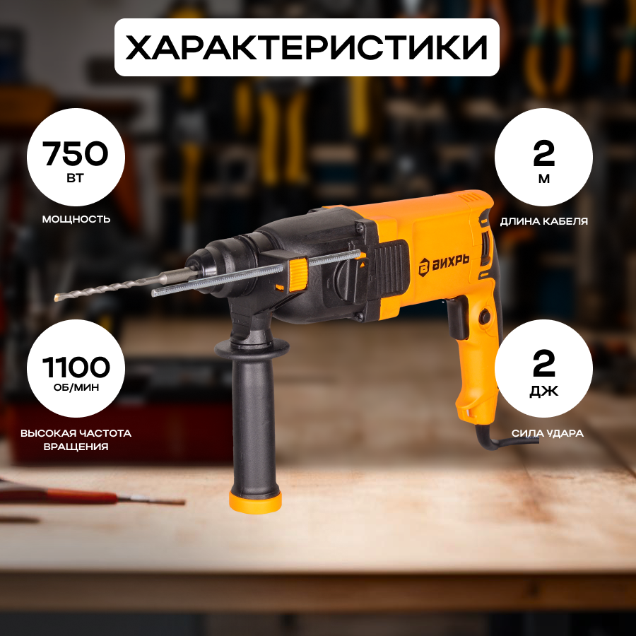 Перфоратор электрический Вихрь ПЭ-0,75В, 750 Вт, 2 Дж, 3 режима, патрон SDS-Plus информация:
