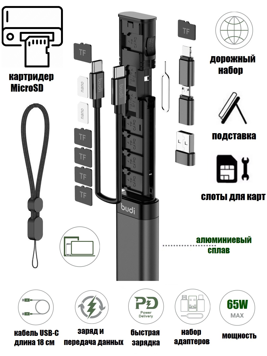 Дорожный набор адаптеров с кабелем USB-C 65 Вт 9 в 1 + картридер + подставка для смартфона информация: