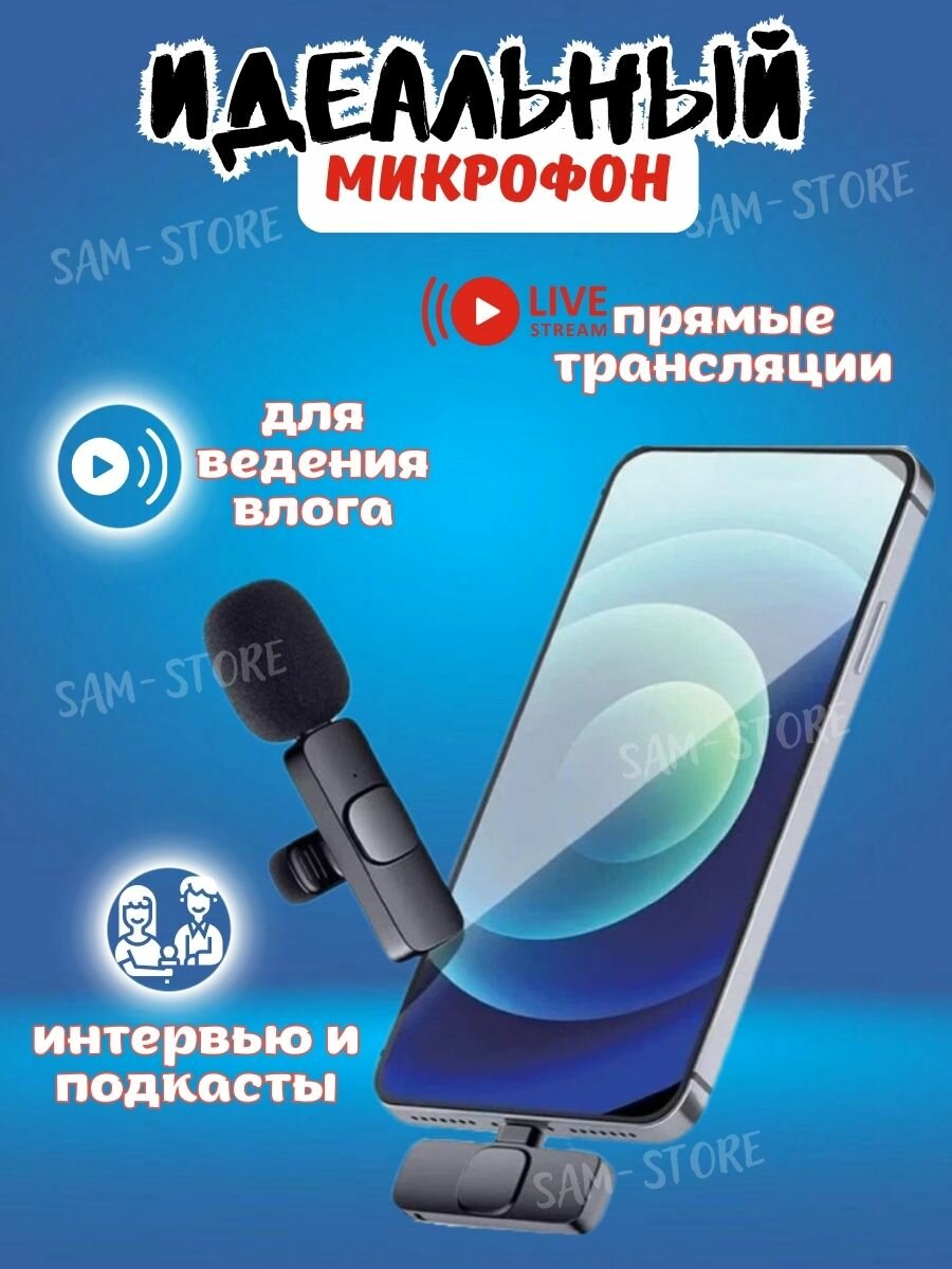 10 цен на Микрофон петличный беспроводной Microphone K9, Lightning петличка беспроводной, черный.