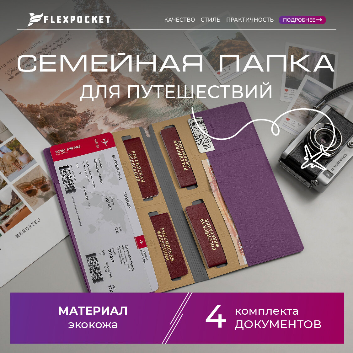 Органайзер для путешествий семейный Flexpocket / Турконверт / Авиахолдер / Папка для документов, загранпаспорта, цвет фиолетовый информация: