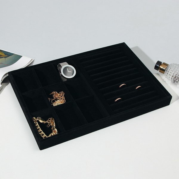 10 цен на Подставка для украшений 9 ячеек и 11 полос для колец, флок, 35x24x3 см, цвет чёрный