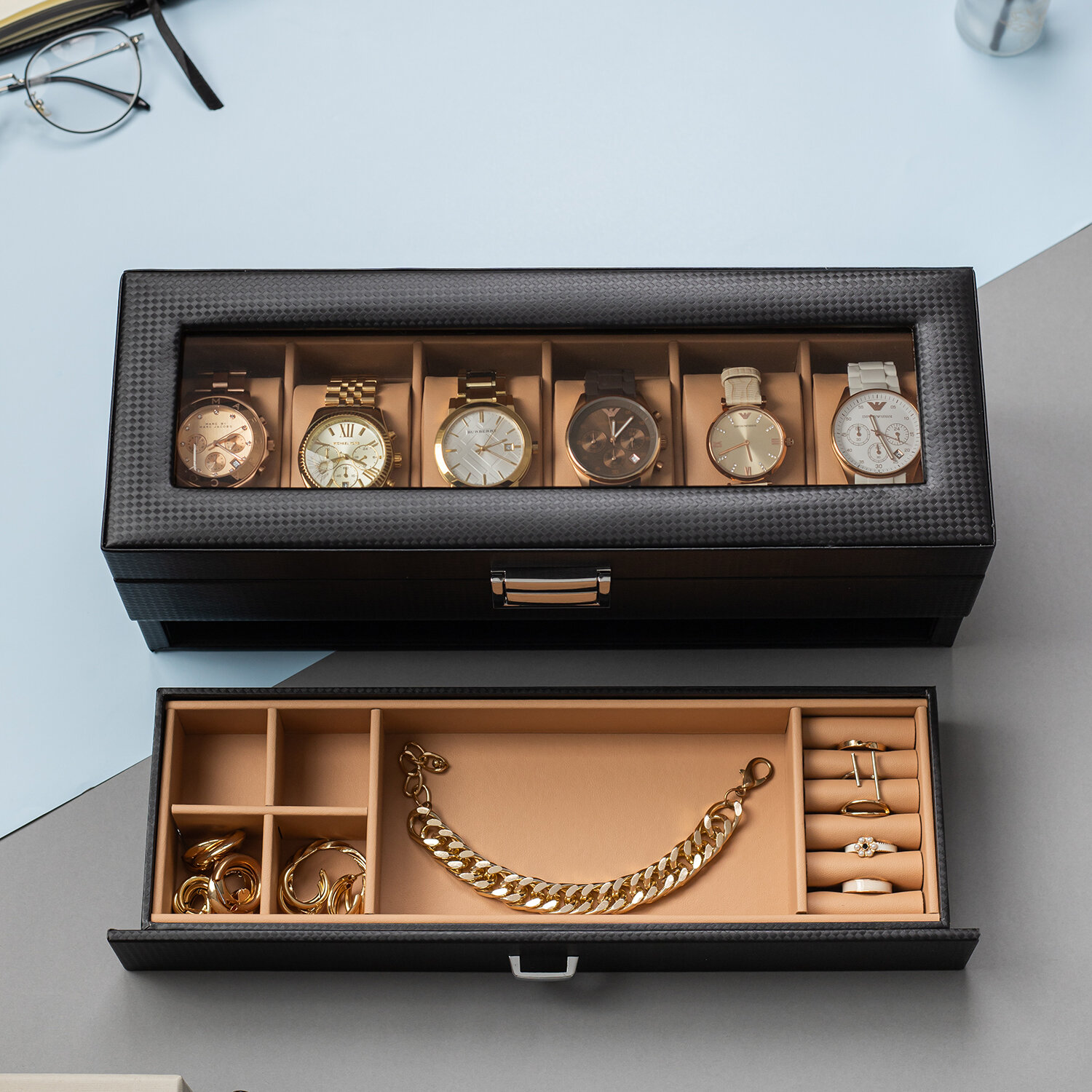 10 цен на Шкатулка для часов и хранения ювелирных изделий двухуровневая CloxBox черная
