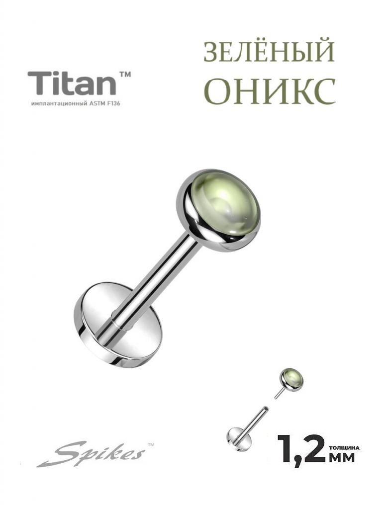 Серьга лабрет для пирсинга уха, губ из титана. Без резьбы, вставка: натуральный камень/зелёный оникс (1*8 мм) 699 ₽