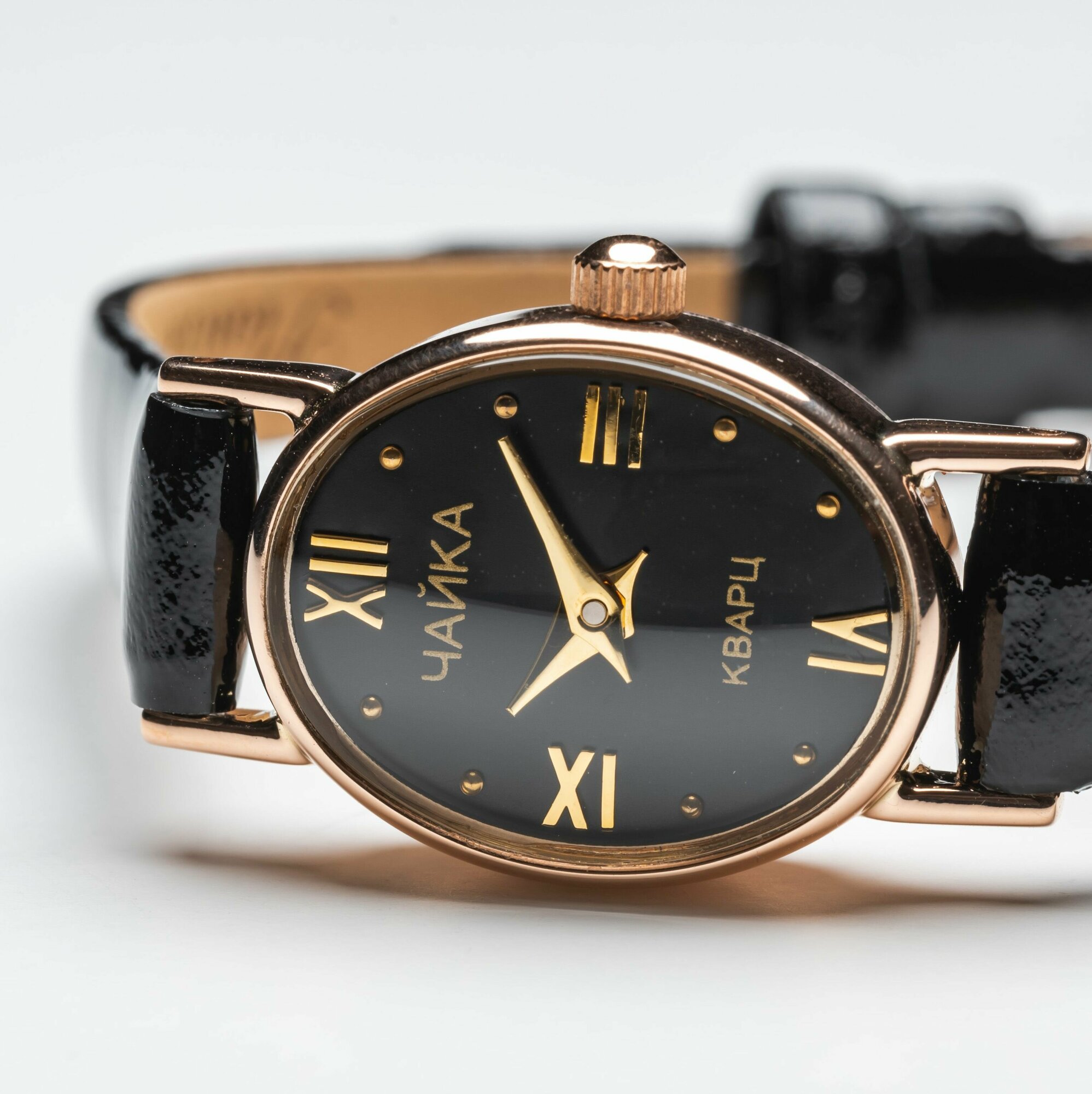 10 цен на Чайка, Часы наручные женские золотые кварцевые с кожаным ремешком "Нежность" 44330.516