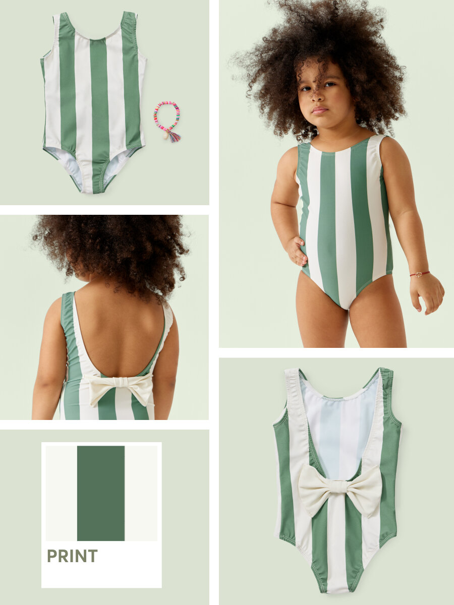 50658, Купальник детский для девочки Happy Baby, слитный с открытой спиной, для пляжа и для бассейна зеленый в полоску, размер 80-86 информация: