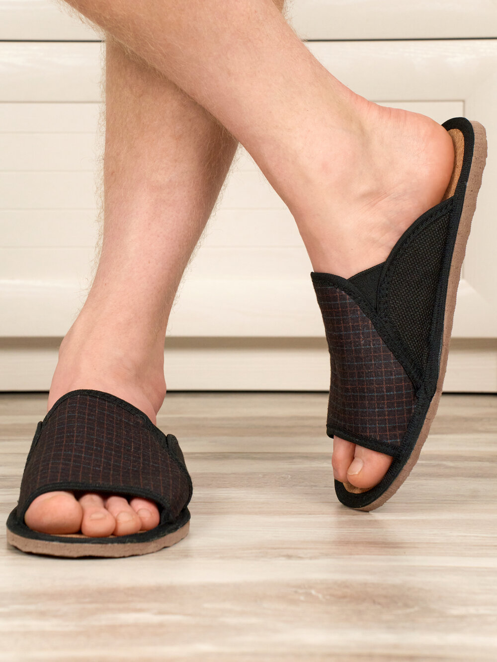 Отзывы на Мужские домашние тапки "LepiloV", открытые, на пробковой стельке, с резинками. Размер 39. Чёрный флис, клетка коричнево-голубая..